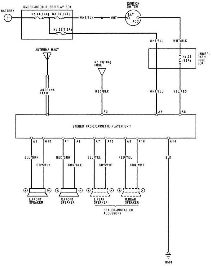 1993 Honda Civic Stereo Information Constant 12V+... White/Blue Switched 12V+... Yellow/Red Ground... Black Illumination... Red/Black Dimmer... n/a Antenna Driver's Pillar Front Speakers 6 1/2" Doors Left Front (+)... Blue/Green Left Front (-)... Gray/Black Right Front (+)... Red/Green Right Front (-)... Brown/Black Rear Speakers 5 1/4" Rear Deck Left Rear (+)... Blue/Yellow Left Rear (-)... Gray/White Right Rear (+)... Red/Yellow Right Rear (-)... Brown/White |