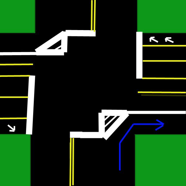 Got a ticket for "disreguarding a redlight". I was turning right onto the main highway and had a deticated turning lane, I'm the blue line in the picture. There is no white line and no yield sign. The lane is seperated from the rest of the lines by a solid white line, and on the other side of the red light on the main highway the outside lane is strictly for turning onto the smaller highway (what I was turning off of).