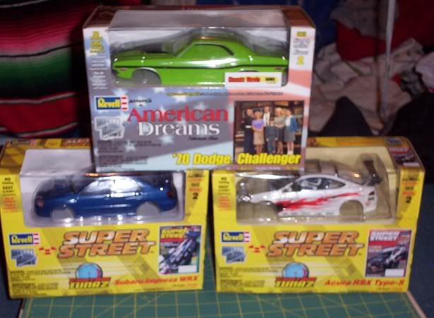 Got these from WalMart tonight. Goddam Revell!! I got the WRX at the NNL back in feb, and it takes you 5 months to get it out to the regular public! Bah! Anyway, as Joeham tells me, the RSX has a K20A2 motor. From the parts I can see, it is stock. The body, is laden with a crappy looking body kit, but nice pearl white paint, but then disrupted by crappy graphics, depicted pretty well in the preapplied decals. The body kit shows mold lines strongly. The fricken BODY KIT!!!! Revell!! Come on fuckers...no stock body!?!??!?!!? I hope the plastic version is stock. The hood is pretty cool with molded open vents. The pre applied cf decals doesn't line up with the one on the front bumper and hood. WRX, already gone over by Jay. Still a nice kit!!! But 1:25!! WTF fuckers!!!!! AGH!!... Challenger is from a show called "American Dreams"? WTH is that? I dunno. Looks like same kit as the Vannishing Point challenger. |