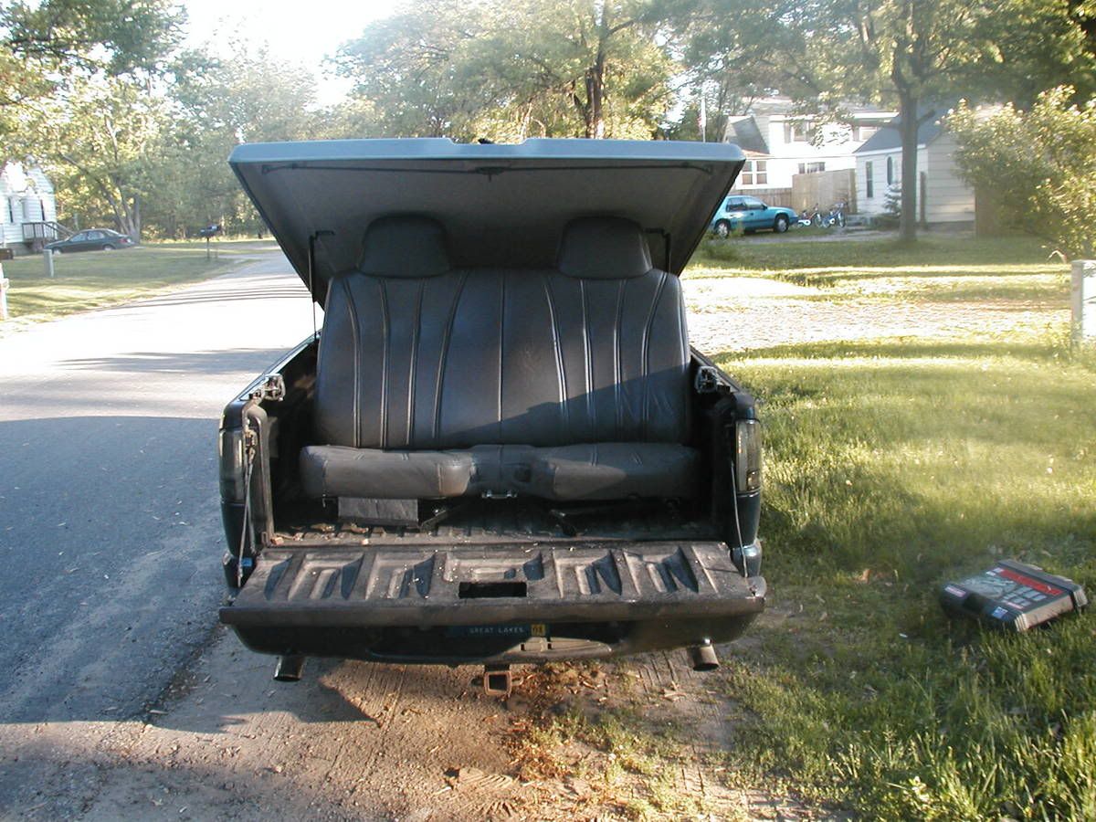 huge pain in the ass...cant bolt it into place because when foled all the way down its still not low enought for the top to close, so it has to stay floating back there so the back end can come up far enough to squish it in there, im working on frameing out the back, and making the back squair, then me m' the grandma are going to carpet it with that speaker carperting, and im putting a pad or something against the back wall, its perpous is the same as the seats, drive in pimpabilitie