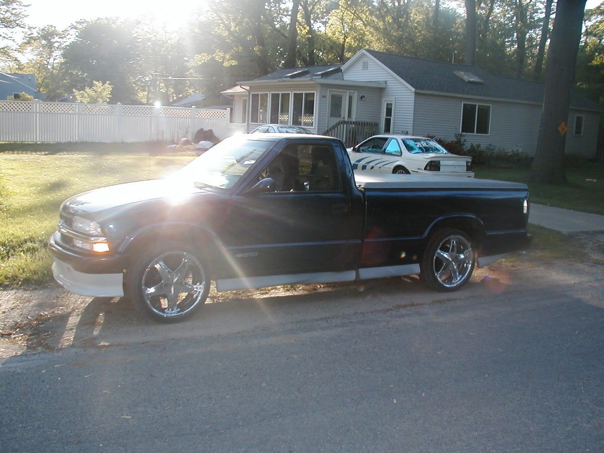![]() shot of the rim, cleanest one so its what you get lol ![]() front view, here you can see how badly it needed a wash the round spot for my fog lights, clear corners, looken to cut out a second spot for a total of 4 parking lights, and im looken at some clear headlights, get rid of the damn fluted things chevy put on there, btw cant forget about those cal view sport mirrors on the side, so much cleaner looking then the stock ones ![]() shot between the spokes of the back wheel, you can see a little bit of the spacer, and you can also see the powder coated drum behind it, no its not rust on there, to be honest i dont know what it was, whiped right off, and powder coat is plastic, and they were blasted clean, probibly just break dust ![]() back shot (ignor the plate, its public information anywayse, its on the back of the truck!), you can see where i hadn't finished it, but the talegate handle is shaved, clear break lights, all 3 of them, andyou can see that ugly ass back window, after paint, it will be a sliding glass window, and has a roll pan on it now, thats the bumper i tryed given away ![]() The buckets i put in it, from a 97 blazer ![]() and you get one guess as to where i put the bench seat ![]() seince these, its been painted silver to black, lowered to the ground and had the rear window replaced |