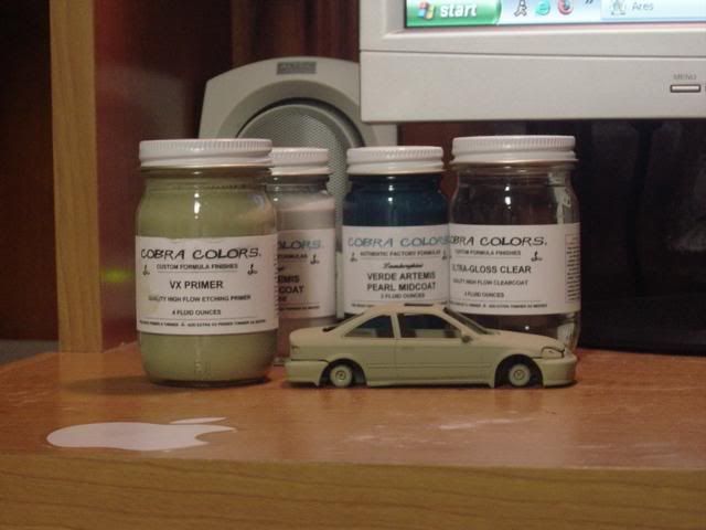 I just ordered from Cobra Colors Saturday and whammy ! Wednesday comes and here is the paint ! It was...Fantastic! Paint ordered was Lamborghini Verde Artemis Pearl and ofcourse VX primer and Ultra Gloss Clear Coat. So here is my try at Cobra Colors. So far so good. Primer went out extremely well. I put it to the test and did some filling with Euro Soft and the primer handled it like a charm. Parts of the trunk were filled (spoiler holes). So far the model is in primer. Tomorrow I will test this beautiful paint out