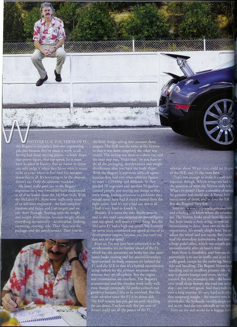 Nice info given his objectives with the McLaren and the objectives with the Veyron. Interesting that he finds its handling defies its weight considering how heavy a car it is. Some engineers really did overtime on that one.Wonder what he would have built if top speed was factored into his equation... perhaps the 97 GT in the 1st place with more power? I guess we can only speculate. It is interesting as others have posted that the McLaren is the standard to which all cars seem to be compared.. even after so many years. I'd be silly to think that a piece of technology is going to remain at the top of its class forever. Automotive magazines, will forever be mentioning the McLaren in some form or another when comparing top cars... just like the Miura, Countach, F40, 250 GTO, BB, etc. Now comes the true test... a Veyron GTR.. will there ever be one? Will it be competitive?. Will there be evolutions of it? I'll be putting my 1:43 Veyron next to the many F1's on the shelf.