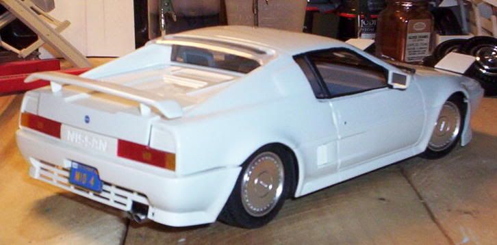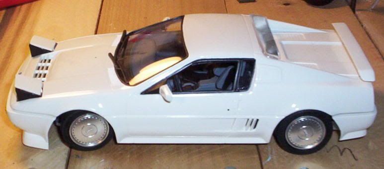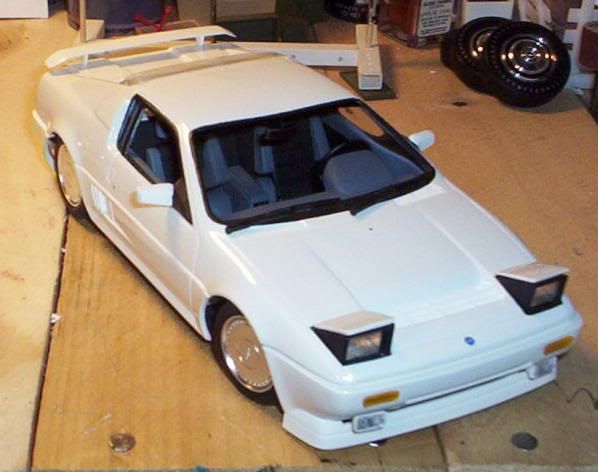 Just finished, built mostly boxstock from the Testor's kit. I did add a partsbox spoiler and exhaust tips made from telescopic antenna. The headlights were cut and fixed in the open position, the front grille slots were opened, and a partsbox radiator was placed behind it. Paint is MM Bright White. Thanks for looking.
