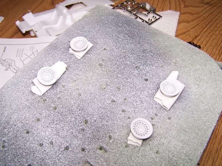 I got the body painted other bits painted body color. I chose Tamiya Racing White, at first i was alittle discouraged because of how off-white it was. Although it is now growing on me, it gives it more of vintage racer look. I also finished detailing the wheels.