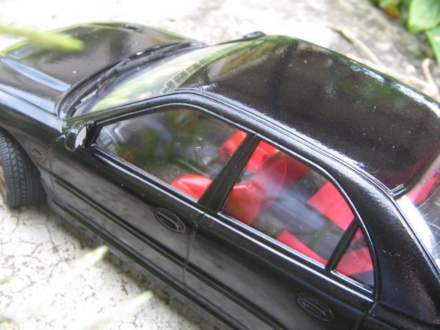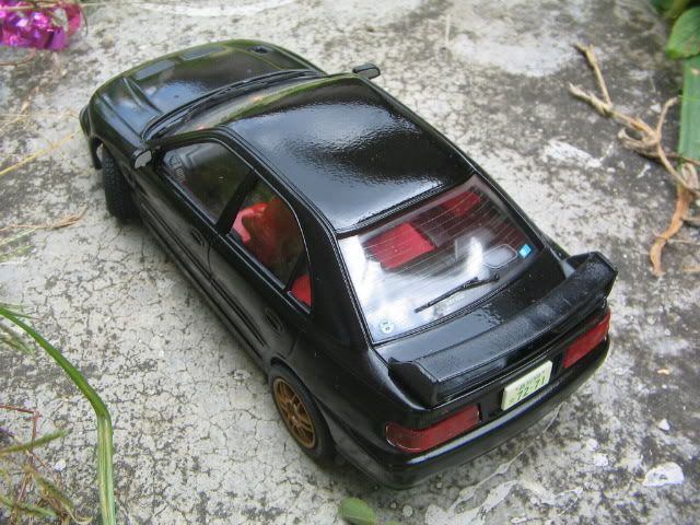 I detailed the interior with red+ black combo, and carpeted mats, and silver speakers on the rear..... The paintjob is not satisfying and this is the first time i am using clear coat... Color is Glossy Black and rims are painted with Honey Gold. Chassis is made simple due the lack of details.. typical Fujimi ![]() ![]() ![]() ![]() ![]() ![]() ![]() ![]() ![]()