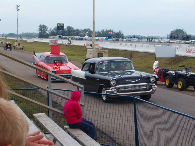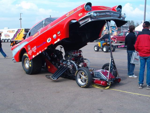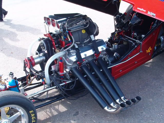 here is the 1957 chevy funny car that im on the crew of, its powered by a 504 ci BBC with a littlefield 14-71 hi helix blower, we run it on methanol, its backed by a eastwest 2 disc pedal clutch and a lenco 3 speed semi automatic transmission, and a ford 9" full floater rearend, im on the crew of the car so if you guys want more pics i can get em, we figure the motor is making about 1800 hp and about 1400 ft lbs of torque, body came from the same mold as mcewans car. so no it isnt one of his cars ![]() ![]() ![]() ![]() ![]() ![]() ![]() ![]() ![]() here is some of the other parts we run, Valasco crank Manley connecting rods CP pistons Lunati cam i think? Brodix BB-2 X-tra heads TD shaft rockers Jeff Johnson Oil pan and valve covers Littlefield blower manifold Mallory magneto Bromwell?? clutch can Enderle fuel pump, (most of fuel system is enderle) Enderle "buzzard Catcher" injector hat Weld 15" AlumnaStar Spindle Mount front wheels Weld 16" AlumnaStar Double Bead-Loc rear wheeld Goodyear rubber all around If you guys want more pics let me know