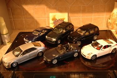 Theres 7 in total. heres the list. Maisto BMW Z4 Maisto Jepp Grand Cherokee Hotwheels Jeep Liberty Hotwheels Nissan 350Z Nismo Edit. Motormax Mercedes-Benz CLK320 Ricko Cadillac CTS-V Picture: