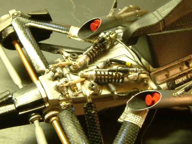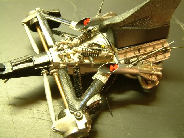 Super work Robrex. I especially like the work you have put into the rear suspension elbows and attachments. I know from experience just how fiddly the stock items area so can really appreciate what you have done. I might be teaching you to suck eggs, but if you are planning to fit the rear cowling note that the stock part doesn't fit very well into the hole above the gearbox for it. I read that on another site and was glad to as you have to make it a bit bigger or the rear cowling tends to bend to shape. Also, the rear wing fits on top of the square box, so be careful with the decals... I spent ages on decalling it only to remove them to fit the wing!