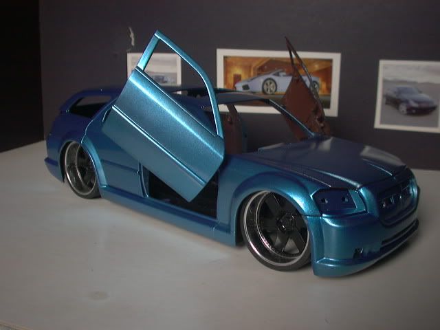 Just took the spinners off one rim.. and found another set of rims that the spinners fit tightly into ( so its not a spinner) .. cut out some thin styrene the size of the rim.. painted it the Kandy kobalt blue.. glued it into the rim.. put some 5 minute Epoxy on the edge of the spinner.. pressed it into place.. and let it dry. and came up with that. |