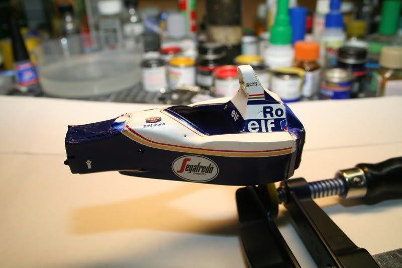 Finally time for an update. Summer is over and there a no bad excuses left. The most difficult part of the project (so far) is the very complex body part. It shall be painted white, blue and semi-gloss black (+ clear coat everything except the black area). Problem is the VERY complex livery. It is a NIGHTMARE in 1:20 scale. Decals are superb, but you need Johnson to make them stick. I used Finished blue and that is a PERFECT match for the decals. No more talk.