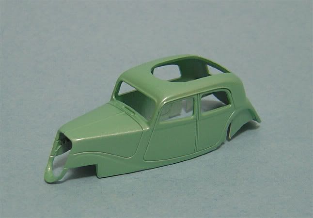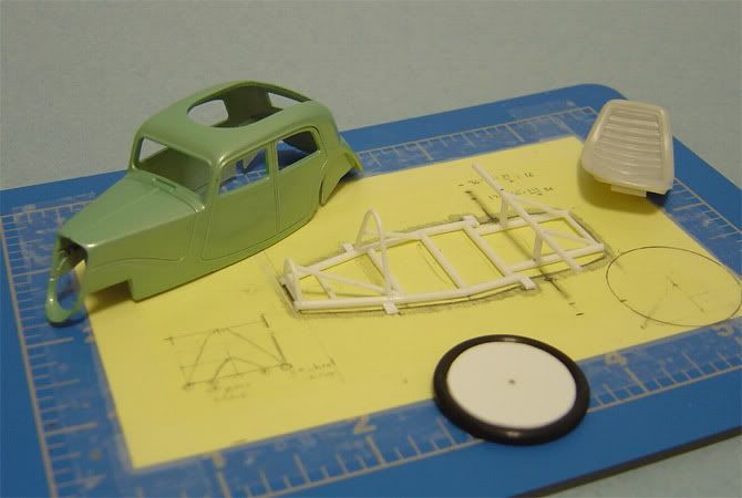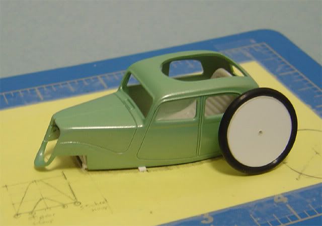 It's fun to read some of the guesses. Swamp buggy is my favorite. But most of you are very close - it's not a pedal car but a gravity racer (a soapbox derby car, but with an implication of a larger budget). The model is a 1:48 11CV (Traction Avant) from Tamiya. All I am using it the body, but I had to start somewhere.