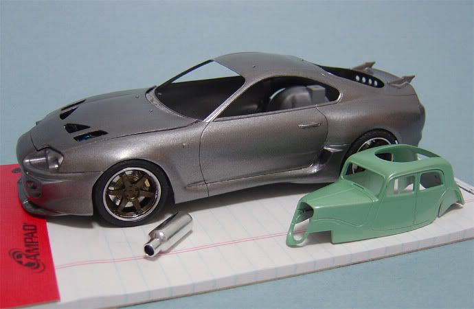 ![]() Well, it appears to be some sort of pre-50's vehicle. Maybe you recognize it, perhaps you do not. It is purposely generic. All handles and hinges were shaved, as were some panel lines. It won't be all green, either, I don't think. That color is the color the scallops will be, the main color will be a dark gray that's almost black. ![]() Most of today went into this darling. It's some sort of tube frame. The front axle hasn't been built yet, but the rear has. Boy, that axle is pretty high up! If I didn't know better, I'd think I were up to some sort of nonsense! ![]() Here are the major components. Make of them what you will, but the biggest clue will be in the following picture. ![]() Everything is together and mocked up. The car will ride a good bit higher than it is, the body is just laying on the chassis which is still kind of stuck to the plan. It should be pretty clear now what I'm building, right? ![]() WHAT?!