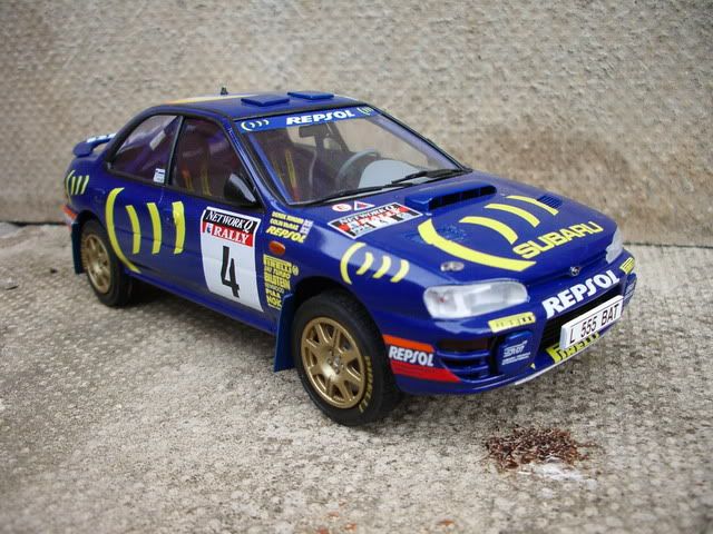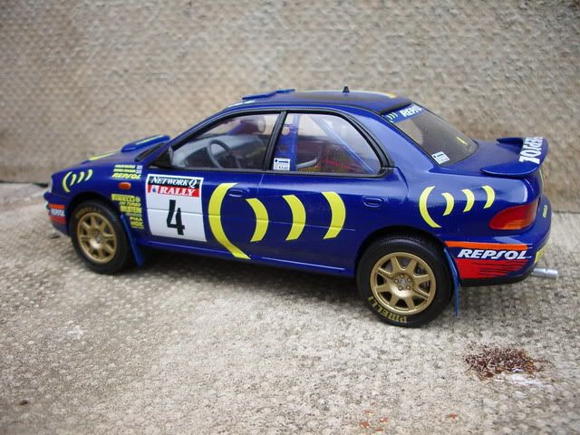 The blue I used was an automotive paint (Ford Isis Blue) and is probably a little too bright as Freakray mentions.The earlier Imprezas were a touch on the darker side.When I built this model I was having great difficulty with the blue as it was a mix of 3 Gunze Sangyo colours and I could not get them anywhere in the UK at that time.I now know of a supplier for these paints,the internet is a wonderful thing!! As Ray also mentions the suspension is probably still a little too high even for a gravel rally (Is it just me or do most Hasegawa kits seem to be that way???) The suspension set up is probably more Safari Rally!! When I build this kit again I hope to correct these few problems and even may add the 555 logos as I feel the car does look better with them.