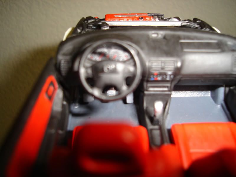 As mentioned, finishing the window trim will really bring out the body's colour. You can mask and spray it as he said, but there are other methods. I happen to use a Sharpie marker with some masking, myself. Judging from your interior detail, you have a real steady hand with the brush, so I suspect you'd do great with the Sharpie method! The interior detail is fantastic, and I a gree the seats look great. You can see brush marks on the package tray however--in a future build, try spraying as much of the interior as you can instead of brushing it--makes a huge difference. Engine bay looks great! |