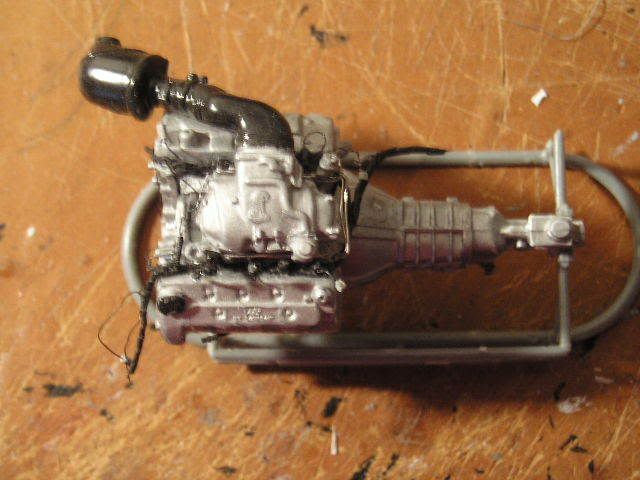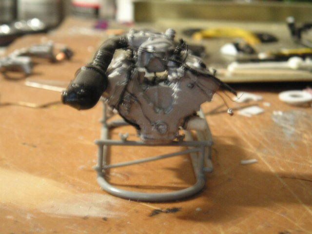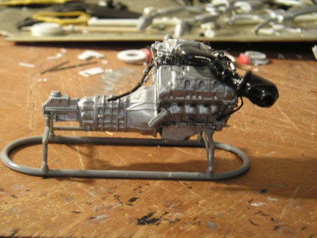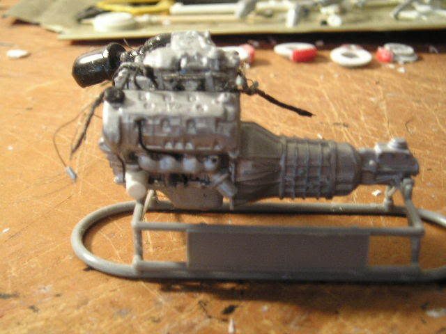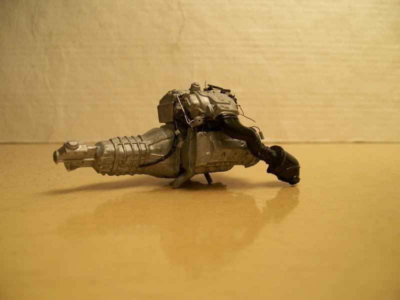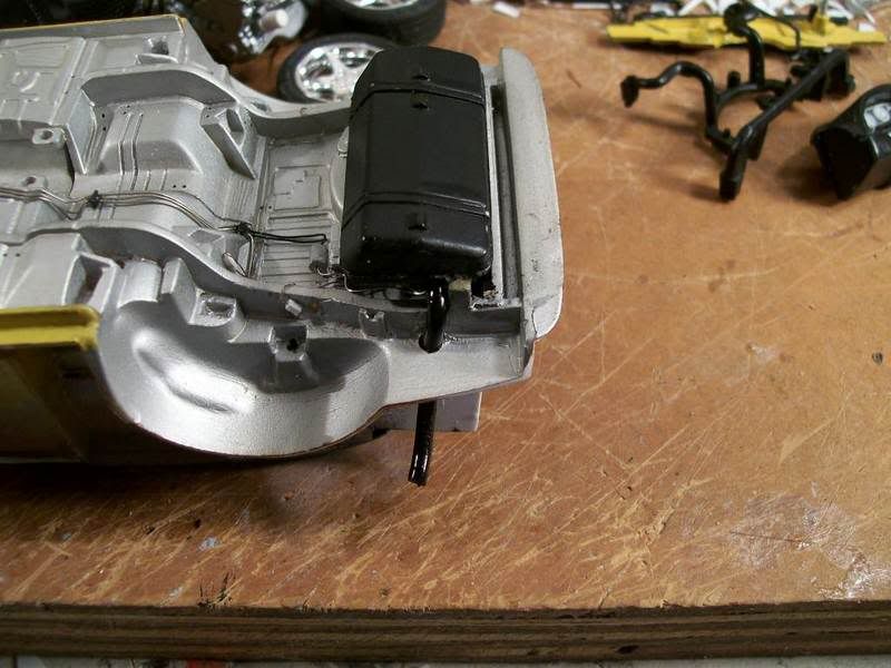 ![]() Here's the engine (not done yet). I discovered that Revell mix-matched parts for the old and new Mustang Cobras. When the body style changed in 1999, so did the engine. Revell only made half the changes The upper intake pictured here is accurate, but I had to get another Cobra (parts kit only) from E-bay to get it. Revell included both the old and new style intake systems, then directed to use the new lower and old upper intake in the directions. These parts don't even fit together, but I didn't know at the young age when I built this kit. So, I finally got the correct part. Revell did say to use the correct valve covers (while including both styles). The biggest problem was the front cover; it included the brackets to hold on the Distributorless Ignition Modules, which the newer Cobra doesn't have (it uses coil-over-plug ignition). I had to cut the brackets off. You can see my complex wiring harness here. It is made of loops of .13mm wire and a bunch of masking tape. See http://www.automotiveforums.com/vbul...d.php?t=631380 for my general method of making wiring harnesses. In this picture, you can also see my fuel rail, pressure regulator, and transducer (that is the black unit at the lower left part of the rail. I still need to add the vacuum harness, EGR pipe, EVR, throttle cable bracket, throttle linkage, CCV hose, oil cap and valve cover decals, and of course the belts and pulleys. ![]() ![]() It's hard to see, but behind the oil filter is the oil cooler. The kit part was the one used on cars with automatic transmissions. This car has a manual, so I had to rebuild the unit to be more accurate. You can also see the large hole in the exhaust manifold for the EGR pipe. ![]() ![]() The 4.6L V8 used in this car doesn't develop enough vacuum to operate power brakes. So, Ford uses "Hydroboost," which uses power steering fluid to operate the power brakes. Here are the resulting complex power steering hoses. The very large one includes the fluid cooler, which runs along the front of the radiator. You can also see the belts and pulleys, with the other hoses and the tank attached. ![]() Here is the firewall, painted and ready to go. The slot on the left will soon be filled with a part that includes the A/C accumulator and the main connector for the PCM harness. Revell called this part the "wiper motor," a component which is actually located under the cowl on the driver's side. The two fittings are for the heater hoses. ![]() Here is the combined chassis and interior tub. I'm planning to assemble this like a real car--everything will be attached to either the engine or the chassis, and when I drop in the engine, I'll hook it all up. If you look closely at the passenger side, you'll see a small black wire. This is actually the line going from the fuel tank to the evaporative emissions canister. I haven't yet installed that part. You may also see bits of red on either side of the console; those are the seatbelt buckles (the "push" buttons). ![]() Most of what you see here is scratch-built. The model had inadequate sheet metal details; I added the bumper brace, headlight surrounds, splash pan, and braces on the outside (connecting to the front of the interior area). Those two silver lines inside the engine bay are the fuel lines. I also had to remove the large block-like units where the engine was supposed to mount. They were simply inaccurate, and interfered with the steering box. ![]() Here is the ABS hydraulic unit. It took 16 pieces of plastic, but was worth it; it looks great. You can clearly see the former locations of those engine mount "blocks" in this picture; they are now angled and will integrate into the front suspension cradle when I install it. ![]() Here's the cradle. I know the yellow is way overdone--I'll tone it down with a wash and a spray of "mud" later. I used a drill and knife to cut out those holes; they were solid in the kit part. ![]() Here's the chassis. I used silver enamel for the metal, then toned it down with Dull Cote. This model is my first time ever using "unit" technology; I prebent all the fuel lines, then connected them with clips. Then, I attached them to the fuel tank. I finally dropped the whole fuel system in as a unit, not piece by piece. The fuel tank was attached to the chassis on the kit part, but... ![]() ...I removed it with a saw, built a top, then reattached it more accurately. I still need to finish the straps at the rear, attaching them to the chassis (for looks only; they won't help hold it). You can see my fuel filter here as well. If you look closely, you'll also see my brake hard lines and the valves that will later connect them with the flexible brake hoses to the calipers. Oops--I forgot to paint the valve. It'll be silver. ![]() Here are my handbuilt steering parts. Only the shocks and wheel hubs are from the kit (the hubs were cut from the original kit suspension). The spindles are handbuilt, and set up to lower the car a couple scale inches. The steering rack is totally scratch-built, and actually works; The center part (the rubber coating off of an electrical wire) and the boots (coils of copper wire) will stay fixed and attached to the frame, while the tie rod ends (a paper clip, with the ends ground down and bent into loops) will move back and forth. It's stiff, but sufficient for posing the suspension. The steering box is part of an old tie rod from a 1/20 scale Camaro I long ago junked. It will have those complicated power steering hoses attached to it, along with the steering shaft. ![]() Here is the rear of the exhaust system. I drilled out the tips, wrapped them with Bare-Metal chrome foil, and painted them black inside. The rest of the exhaust is Testors Metalizer aluminum. ![]() Here is the trunk, with flocking and hand-built side panels. I opened the trunk lid on the body--that was a nightmare. I'll show that when I finish polishing the paint on the body. You can barely see my paper-clip hinges; the one on the left is up, 