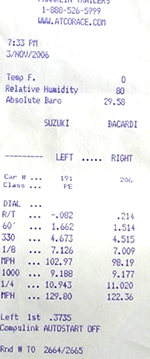 It was pretty, but it happened ... Hyde went 10s. First off, a HUGE thanks to Josh @ Chico Race Works ... this run was for him. Thank you JOSH!!! I took the day off of work on Friday to trailer to Atco Raceway, one the bigger NHRA tracks in the region. It's a 2.5 hour driver, but Philadelphia traffic screwed me and it took over 3.5 hours to get ther *sigh* We rolled Hyde out of the trailer, got it tech'ed warmed up the engine and got in line. Atco was also doing the "put a cone in the groove so the street tire cars do not pull up the rubber in the groove." *sigh* So a stupid little pylon was forcing me out of the groove. I had a decent burnout, managed only a 1.9 in the 60', but made a whopping 103 mph in the 1/8 and went on to a blistering 11.3 @ 130 mph. I got right back in line, and not even 10 minutes later I got run #2. I made some adjustments to the boost controller and managed a much better burnout. Still out of the groove I nailed a 1.67 in the 60' for a 11.12 @ 128 mph. That was a new best for Hyde as last year I went 11.13 @ 125. I got out of the whole better, but the boost controller adjust obviously killed my mph. So, to go for the 10, I cranked the gain back up and then some ... fiddled with the ratio a little bit and got back in line. That's when I learned there was a separate line for slick and drag radial cars. If you are in that line, they move the cone and you get the groove. I was too far in my line though to switch and I just asked the guy in the burnout bow to move the cone which he did! ![]() Funny stuff: So I attempted a burnout and it failed misserable. I just hooked up and hte car inched forward pushing the front tires. I killed the burnout, and reinitiated the process for a second burnout ... no dice. The car just went forward. I think the clutch/flywheel was not holding enough power to smoke the tires in second gear, but it was grabbing enough that pathetically pushed the car forward ... such is life. At any rate, trying to do 2 burnouts was enoguh to really tick off the clutch/flywheel combo. I stage, the light goes green I an slipping the clutch in 1st gear for a 1.7 in the 60', the clutch pedal falls to the floor, I slammed it into 2nd and the car starts to bog out ... so I through it into 3rd and the clutch pedal popped back up and I just started to drive to the end of the track as the run was spent ... but then I realized the mustand in the other lane was catching up, so I floored in 3rd gear as he flew past me. I reeled him in really quick. Hyde actually went 79 mph in the 1/8 to 121 at the 1/4. Hyde went 13.2 @ 121 to his 13.6 @ 105. I dont think he was very happy about that ![]() I pulled around and Raul ran over. He asked what happened as the run was obviously botched. I told the clutch completely went out. He said, "So are you done? Do you want to pack up?" I said, "Nah, I'm gonna get in line with the slick/DR cars and get one more run." Since the slick/dr line does not move until all of the street cars are done, I figurred I'd have time to let the car cool off .... no dice. I jumped out of the car (first time all night) and they called us to the lanes! Back in the car I go, knowing this couldn't be good with everything so agitated in the drivetrain. The run: So I roll up and the burnout gets flubbed again (no surprise!). So I start to stage with a fire-breathing slick'd mustang in the other lane (listen to his engine road in the video). Love or hate them, there is just no denying that Mustangs can be very fierce. Anyway, regardles of my ET attempts, I've really been trying to get better at my reaction times.I had a .18 earlier in the night and a -.013 (talk about a close red light) and on the run against the mustang I redlit with a .082 to his .214. I had a 1.662 in the 60' to his 1.514. At 1/2 track we were real close: Hyde: [email protected] Mustang: [email protected] He was much quicker, but my GT35R was building speed at a much quicker rate. As I hit 3rd gear, I felt a bizarre hesitation in the acceleration. Apparently the turbo crept to over 33 psi for which we are not tuned. The map in the car is only tuned up to 26 psi and after that NoShoes has it pulling timing and adding fuel ... let me tell you, that is something you can feel. It was like trying to run in water. The final was: Hyde: [email protected] Mustang: 11.020 @ 122.36 Not a bad run for a bad clutch/flywheel combo and going flying off the tuning map. ... I can only wonder what it will do with a completed and the Tilton. It was an awesome race and he waited at the turn around to give me a big thumbs up. When I got back into my pit area he drove by and yelled that he works for Toyota ![]() I am now, 100%, done for 2006 ... really, I am done. No more. So here's the video: http://www.jekylhyderacing.com/image...0306_10943.wmv Here's the slip: