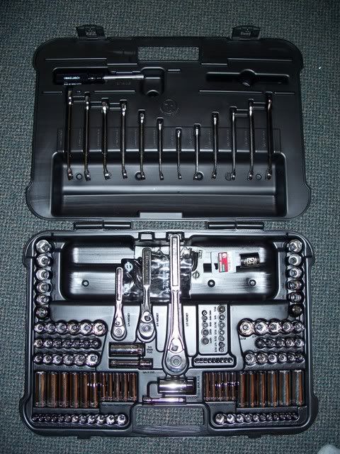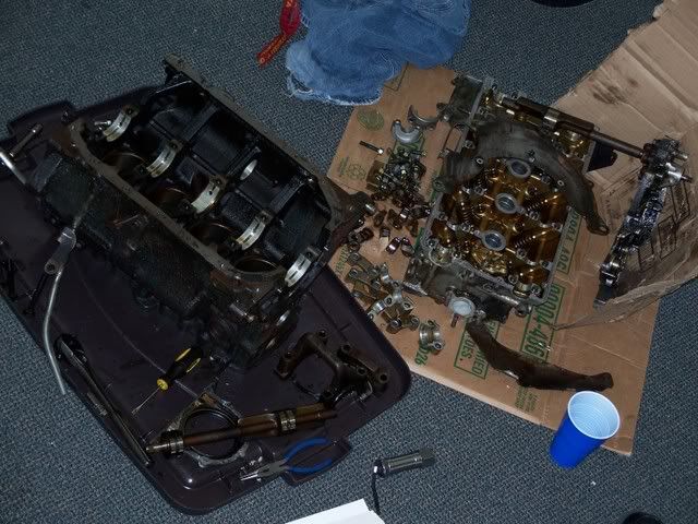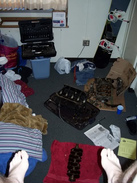 ![]() Heres my new tools. I was sorta happy and sad to get them dirty for the first time. I think its a 155 pc and it was like 35% off. I like them a lot. ![]() Theres my sitting in my lofted bed looking down on the floor. Yes, this is happening in my dorm. Its a good time. I was super careful though, not a spot of grease hit the carpet. All the work was done on cardboard or the lid to the box its being stored in. Its sort of a pain though, I think I am going to have to get a engine stand to do the build. ![]() Closer up of the block/head. |