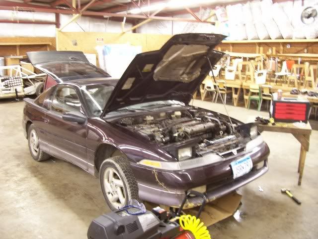 This is the project thread for my baby, the Purple People Eater. The plans are to make it a stock appearing "sleeper" sort of car. I got it in March of 2006 and have collectively put 1150 miles on it. I've spent a gross amount of time working on it, I estimated that I've put in around 20 minutes of work (either on this car or one of the parts cars for it) for every mile I've driven in it. The car was not taken care of before I got it, as made evident by the fact that I've been over every single part under the hood of the car and many everywhere else. I wont stop until this car is perfect, which will be a loooong time. ![]() My baby is going to be transformed into a stock appearing street car bent on nothing but total street domination . Only kidding, its going to be a fun car for me to work on at night and cruise in on the weekends. I'll probably take it to the tracks once in a while, but its largely going to be a fun weekend car.Current Mods Engine and Bolt-Ons K&N air filter Extrude honed intake manifold Evo III exhaust manifold, gasket matched Big 16g, ported hotside Ported 1g o2 housing 3" Megan downpipe, test pipe, and catback JoeP MBC Drivetrain, Brakes, Suspension, and Misc. Modified stock 91 shifter 95 AWD 2 piston calipers Hawk pads Second gen 300zx wheels, 16x8, painted gunmetal Yokohama tires Removed rear seat and some interior, spare tire, AC, bypassed heatercore, removed sound system, various other weight reduction Interior and Exterior Autometer Ultra-Lite 30 in hg/30psi boost guage Autometer Ultra-Lite 0-100psi oil pressure guage Autometer Ultra-Lite 120-240 water temperature guage Guages in factory HVAC control spot, controls relocated to below where the radio is supposed to go In The Closet Comp 101200 cams (FP2's) ARP headstuds Walbro 255 ACT 2600 with a sprung 6 puck disk ACT XACT chromoly lightweight flywheel Wanted DSMlink JAW (DIY wideband o2) 2g MAF Hard intake pipe Supra SMIC with custom IC pipes 2g/Evo III/tubular 02 sensor housing 880cc/950cc/1000cc injectors Aeromotive/Fuel Lab FPR Custom SS lines from Jegs , fuel filter to rail, FPR install kit, turbo oil feed and return FP 18g-6SL2 AGX/Prokit combo Rear sway bar Front and rear strut bars 4 bolt rear Shep tranny Harness bar or 4-6 pt cage Racing seat, 4 or 5 pt harness Smoked out bar lights and tail lights Tint Repainted body and wheels CO2 IC sprayer Direct port or wet shot nitrous Goals 325 whp on the 16g, 375 whp on the 18g <12.25 1/4 mile on the 16g, <12.00 1/4 mile on the 18g