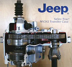 NP 228 and NP 229: These two transfer cases are perhaps the weirdest ever installed in a Jeep vehicle. The NP 229 used a vacuum 2wd/ 4wd switch on the center console and had a shift lever that read H-N-L. Both models featured aluminum cases and chain drive. Early models of the NP 229 featured a lock out feature to keep the transfer case from being engaged while the vehicle was moving. This was necessary because the viscous coupler could be damaged if the vehicle was moving the slightest bit. The NP 228 and NP 229 were used in 1984- 1987 behind an AMC 4 cylinder in XJ Cherokees and XJ Wagoneer's and in 1982-1991 full size Jeeps as the Select-Trac option. NP 231/NV 231 ![]() Once known as the NV 231 and then the NP 231, these two transfer cases are basically identical and share interchangeable parts. Nowadays this transfer case is simply labeled the 231J. The 231J features an aluminum case, chain drive, a driver side front output and centered rear output. It has the lowest low range gear ratio of all Jeep transfer cases at 2.72:1, with the exception of the NP241OR (more on that later). The major variations of the 231J-transfer case are the input gear which can be found in 21 and 23- spline and a short, medium and long versions of each. The 231J is a very strong transfer case and can be found in a variety of Jeeps since its introduction in 1988. The 231J transfer case is strongly supported by the aftermarket and can be easily upgraded. It can be found in XJ Cherokee's, MJ Comanche's, and YJ Wranglers as the Command Trac transfer case. It has also been the Command Trac transfer case in the ZJ Grand Cherokee since the ZJ's introduction in 1993. The new TJ Wrangler continues to use the 231J except in the Wrangler Rubicon.NV 242 ![]() The NV 242 can be found in XJ Cherokees and ZJ and WJ Grand Cherokees where it is commonly known as Selec-Trac. It is a chain driven aluminum cased transfer case and it offers a wide range of driver selectable options, including 2wd Hi range, full time 4wd, and part time 4wd high and low range. Its rear output is centered and front output is to the driver's side. Although not as strong as a 231, it is still plenty stout for the Jeeps it was offered in.
