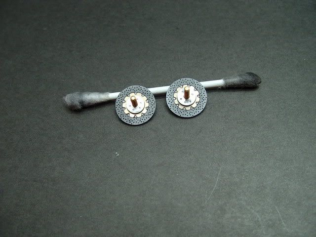 Got the rear brake rotors done today. SMS photoetched items. They want you to stack 3 seperate discs to give the rotor some height in the middle, so I just lathed out a piece from aluminum rod instead. Driled the six holes in them using my pin vise. My camera can't seem to focus on them that well but they look way better in person. Sprayed the rotors with Finisher's carbon black and then rubbed with graphite powder. ![]() Here is a shot of the chassis with the cf added instead of the foil, also added a piece of photoetch as the VIN plate on the rear rail. Added the SMS reservoir cap, somebody really should cast these things. ![]() Thanks for looking, and comments and tips are always welcome. Mike. EDIT-Figured out the camera, new pic of the brakes. Last edited by mikemechanic; 03-05-2007 at 09:28 PM. |