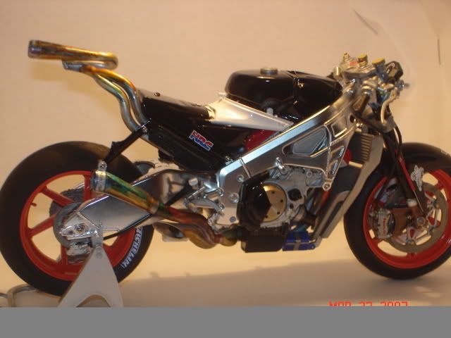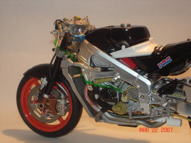 Nice work on a nice looking bike. Seems like you've mastered the Repsol livery. A+ on that. Exhaust looks a little over wheathered in my opinion. Perhaps go a little easier on that next time. Hard to see if you have done it by hand or not. Try using the air brush or the Tamiya wheathering set. Regarding photos outside light makes better photos but try also to step away from the model and perhaps use a tripod. With todays cameras you get large images that can be cropped in a photo editor and show a lot more detail.