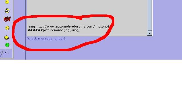Well, look at the last screen shot. [img] http://blah blah ( The Picture file ).jpg [/img] You start opening with [ img] and end it with [ /img] Just do it repeatly each time you post a pic. ETC: ( Without spacing after the [ img] and before [ /img] ----------------------------------------------------------------------- [img] http://http://files.automotiveforums...icturename.jpg [/img] Post the second pic. Do the same, [img] http://files.automotiveforums.com/up...icturename.jpg [/img] --------------------------------------------------------------------- See if this helps again.. Sorry, my explaination is real bad... probably someone can explain better or if not, read http://www.automotiveforums.com/vbulletin/t34758.html again. Just ignore if the words break, hope that you will understand.