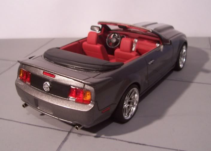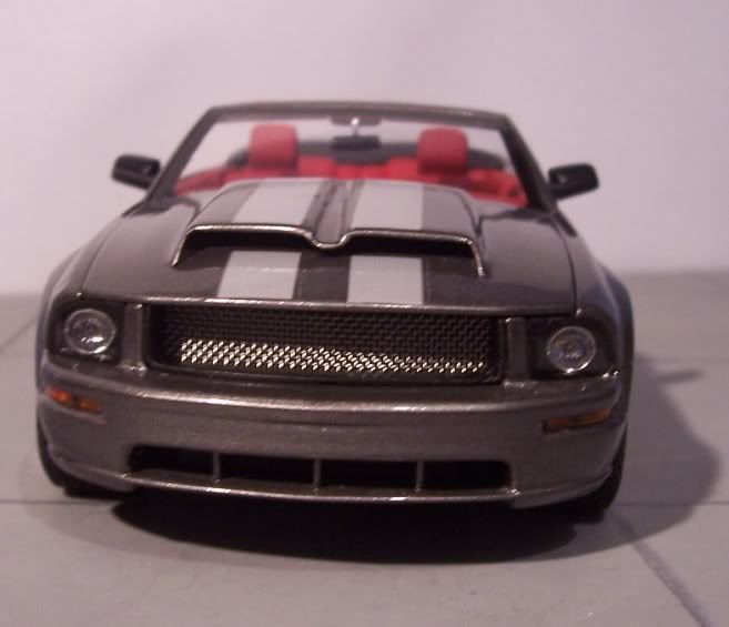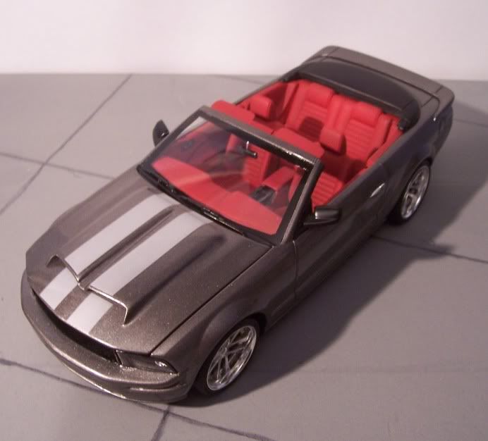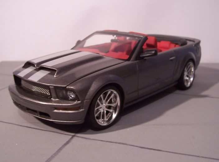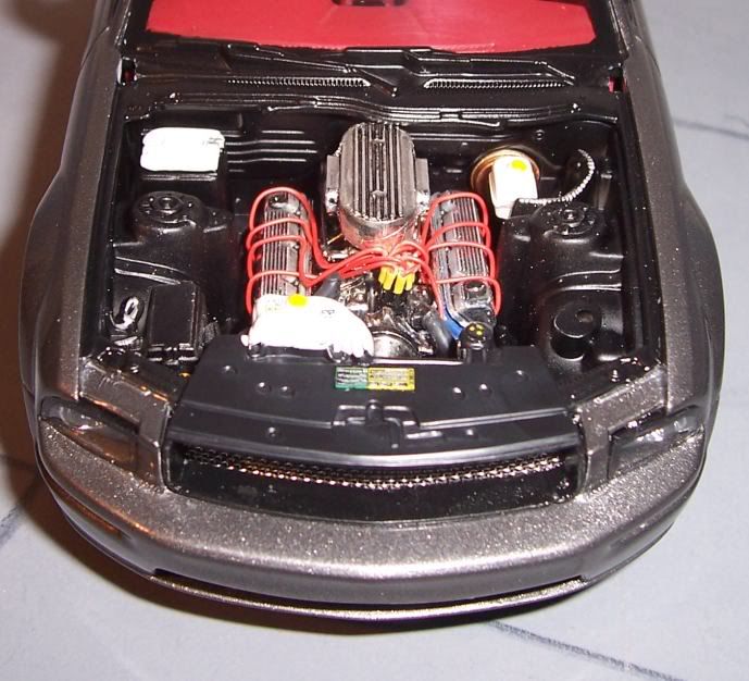 Revell kit, converted to convertible? Bonnet hump is a shaved down one from an old Chevelle from what I can recall, rims via Aoshima, brake discs via Fujimi, rear spoiler from the Fujimi 300zx convertible, rear cover is a resin cast of the one from the BMW 850 convertible Revell Germany did. Replaced grill detail with mesh and opened up the lower bumper vents. Engine is stock lower end with a transplant from the Revell ford 427ci detail set, wiring detail thanks to help from stevk2003, mikekechanic and luke'57. I actually wanted to put the blower in but Id already don the hood and it wouldn't fit.I know its probably upsetting the purists but I like it and got fed up of waiting for Revel to release one. ![]() ![]() ![]() ![]() ![]()