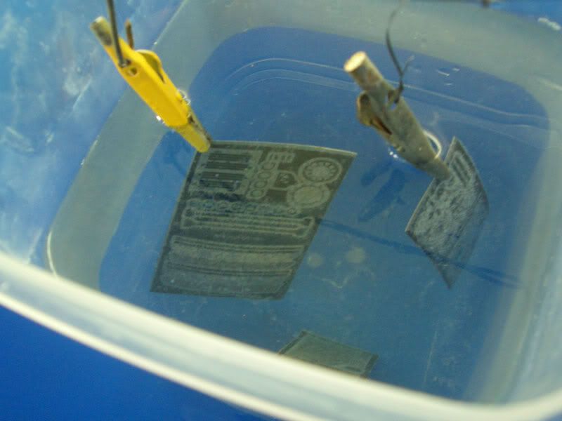So we have 50 min. left: more than needed ![]() I guess we deserve a good beer before the etching ![]() Time to cut th plate in the desired size (do it with a sharp knife since scissor could bend it) and peel the protection tape: you'll do it quickly at daylight, be sure to avoid overexpositions. ![]() ![]() Insert the plated (peeled LOL) in the "pocket" you done with slides, fix it with tape and expose it in the UV device. Normally it need 2-3 minutes each side. I done a kind set-up on my UV device pulling tall the glass board approx 10-12 cm over lams: it help me a smooth and costant exposition, so times are a bit longer: approx 6 min/side. Also with old developer you may help chemicals with 2-3 mins more of exposition. So other 12 mins, 38 left, we have to start run ![]() ![]() (just in case you want ask: my device isn't do by paper LOL I just filled with cardboard to avoid UV rays go around LOL) Develop the board: it would take a couple mins for side with 20° warm solution, this is teh result: ![]() Like you'll see holes are now bare metal and stuff we need to keep are protected by a gray/green/blue laquer. 33 mins left: time to etch. Etching solution I used need to be warmed at approx 45° (I believe) and need to be stirred often. Or you buy a etching station with pump and warmer or... ![]() I put warm water in the big blue container, later the chemical reaction help to keep the temperature HI, may be useful cut your board in several parts, etching times may be different: ![]() I found this solution to keep parts: ![]() despite at begin acid is transparent, it quickly become cloudy: look what happened: it eat me a new pincher in few minutes! May be was a strange material, old two dirty pinchers are ok! ![]() Every so often mix the solution, stirring it with a plastic wand and check it: you'll see that acid start to eat ![]() ![]() Finally after 20-25 (30/40 with 3-4 times used acid) is time to wash your etched plate under water, dry it and wash on solvent to clean from the laquer: ![]() After cleaning, this is the result (1h later ![]() THE END! thanks a lot guys for read it, sorry if something was unclear (also for shi##y english) and be free to ask, if I can I'll answer. ciao gio