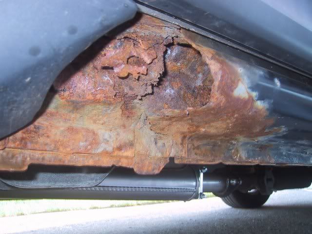 Those are incredible pictures. You must live next door to a salt mine (small attempt at humor!). I'd clean some of it up and put some type of rust inhibitor (Rust Stop or similar; - you want something that will turn the surrounding rust inert) and create a surface that can be sanded or primed, (but that doesn't mean you can leave the rusty metal there). It will slow it down though. A few more weeks will not make that much difference. The damage has already been done. Looking at the pics, the inner rocker should clean up reasonably well with plenty of wire brushing (high speed grinder with a wheel; - CTC has a grinder on sale this week, I think). Those 'pinches' in the bottom of the rocker are where the welds are. The holes on either side of the pinch are designed to drain the water that finds its way in. If there is cloth in there, it could only get there two ways; - during manufacture, (the old pop can in the closed panel thing the guys on the line used to do to drive folks nuts!), or it was placed there to hold something in place (bondo?) by the shop that repaired the damage you mentioned. Either way, the cloth material would hold water and consequently rust everything it touched. Nice new shiny muffler, by the way! Last edited by 1999montana; 05-27-2007 at 02:22 PM. |