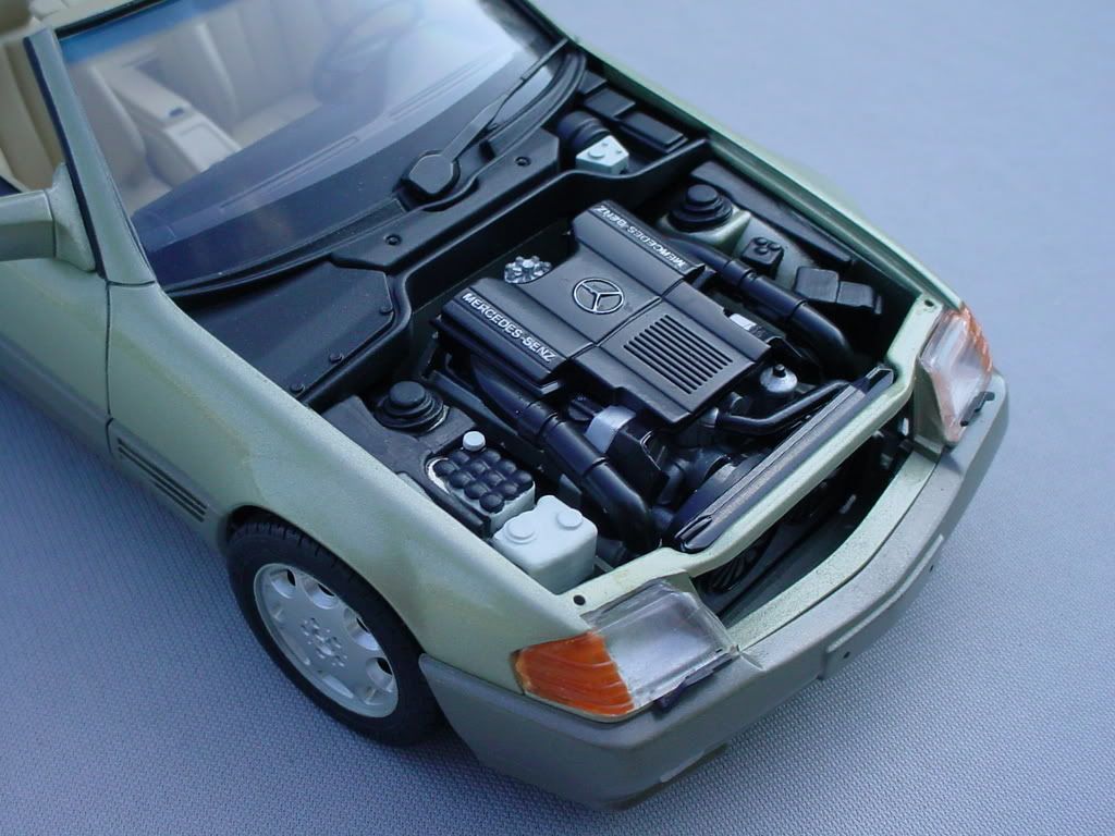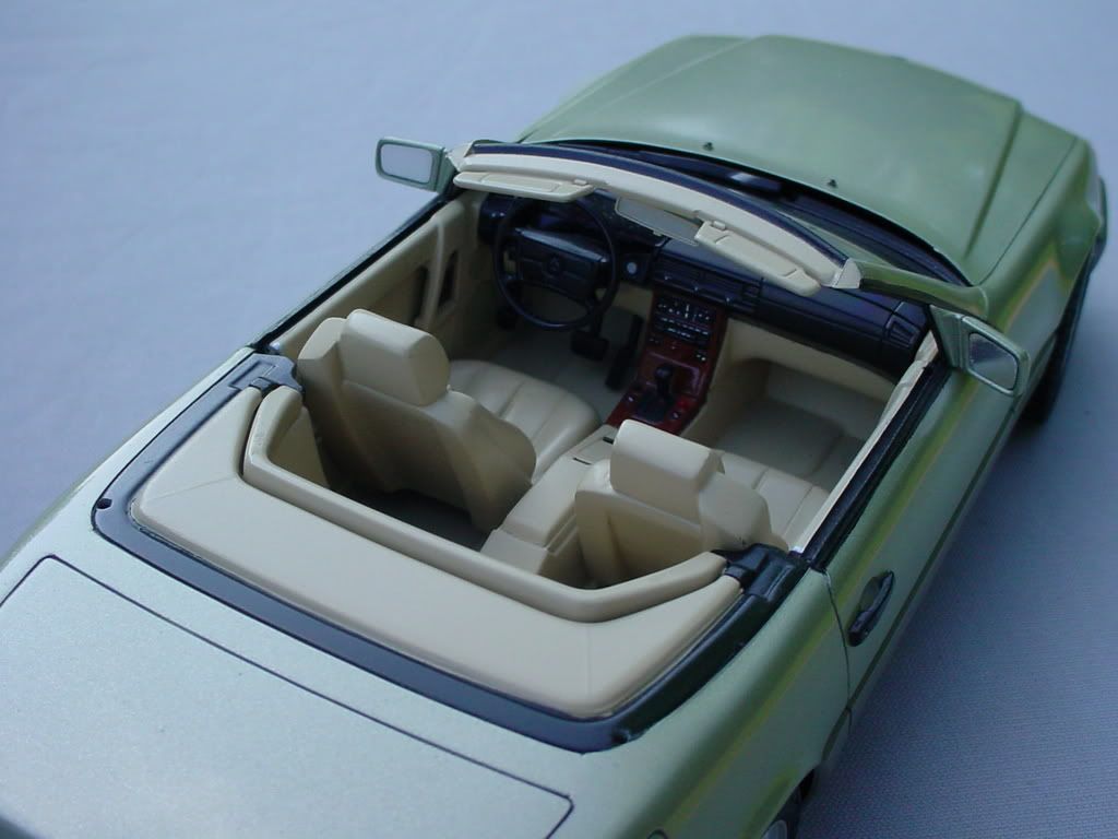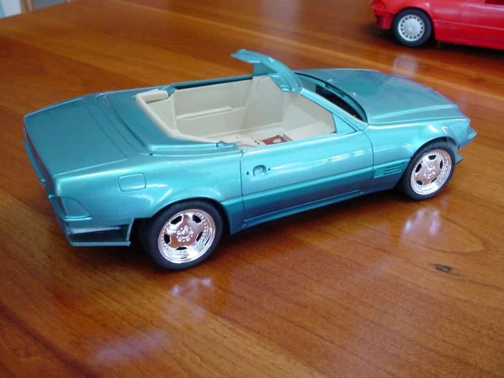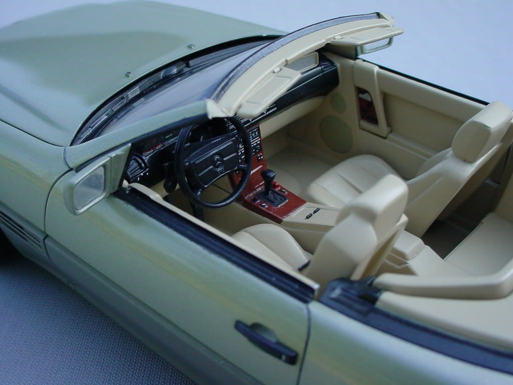 I'd posit that I'm an expert at the Tamiya 500SL kit! The painting instructions are wrong in a few areas, namely the trim around the tonneau cover. It should be painted semi-gloss black, rather than X-11 silver. If you paint the interior a color other than specified in the instructions, its best to get a brochure (but I'll say that the interiors are pretty monochromatic, i.e. beige seats, carpets, sunvisors, rearview mirror, tonneau cover). The engine compartment is pretty simplified, lacking some of the details Revell's kit captures (though that kit is wrong in major areas, such as the completely wrong underside and suspension from their older 560SEC kit!). Also, there is a couple of small sinkhokes on both ends of the trunklid that should be filled. Seats are two pieces and the seams should be filled. Here's my version of Smoke Silver, built about 12 years ago. I think its MM enamel Champagne Gold with some silver...and way too green. Over the years, the paint has lost its sheen; I might strip and repaint Cobra Colors Smoke Silver (thanks Leon for fulfilling my request!). Also, the grill broke. It wears Tamiya S600 wheels, which became standard on the 500SL in 1993 (in the USA). The two others (CC Guards Red and CC combo to make Mercedes Teal) are in progress. ![]() ![]() ![]() ![]() ![]() ![]() ![]()