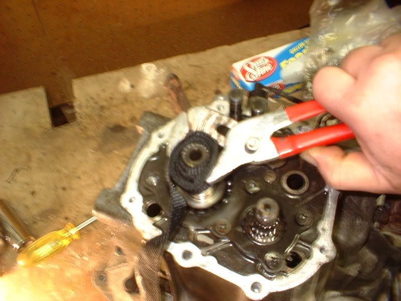 Here's how I got the countershaft nut off. Shifting into 4th or 3rd did not help, made no difference in the resistance of the shafts so I had to figure a way to stop the shafts from turning. Once I got the shift fork removed, (it pulled off easy once I removed the circlip) Input shaft 5th gear and countershaft 5th gear both pulled off easily by hand, no puller required. With so little clearance I don't know how I'd have gotten a puller in there anyway. So what I did was just wrap some nylon strapping around the input shaft, enough to be about a half inch thick and then used some slip joint pliers to grip it with. I could hold as tight as I wanted without risking damage to the teeth: