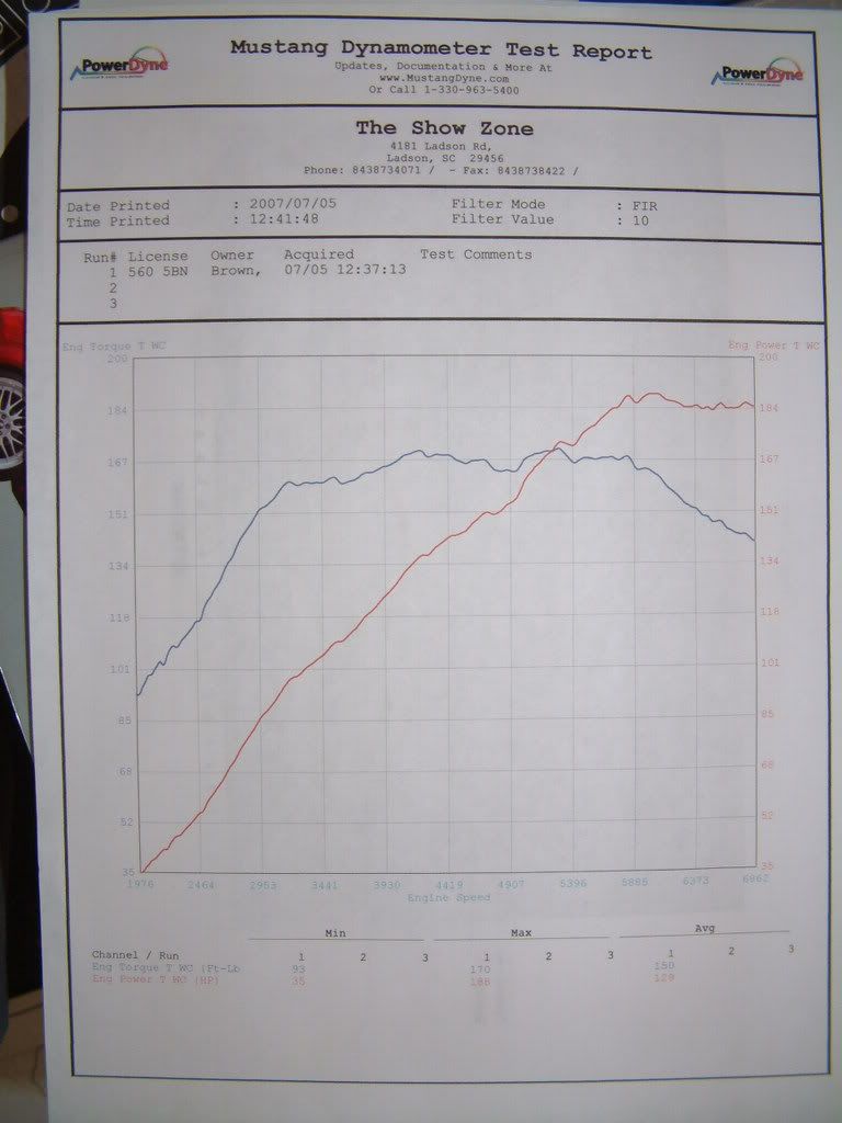 Sorry if you cant really read the graphs to good, my scanner just broke so I tooks pictures of them. My boost hit 10psi and then tappered to about 9. My gauge never went over 8.5psi so I guess its a little off. Anyways tell me what you think. 188WHP and 170Tq http://i189.photobucket.com/albums/z...e/DSCF1983.jpg http://s189.photobucket.com/albums/z...t=DSCF1982.jpg
