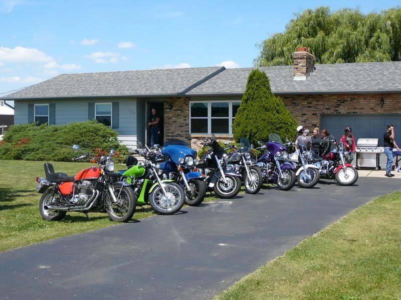 My dad recently passed away in October of 2006, and on his birthday this year (July 22nd) I got some buddies together for a memorial ride. The first pic was taken with the bikes lined up in front of a friends house that couldn't ride (he had to sell his bike) but hosted the destination get-together at his house. My Fatboy is the dark red one in the back of the photo. The second is with all of us standing by are bikes. There were 2 others (total of 11 bikes and 16 people), but they left before the photos were taken. It was a great time, and honored a great man and motorcyclist.