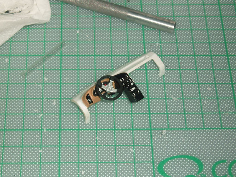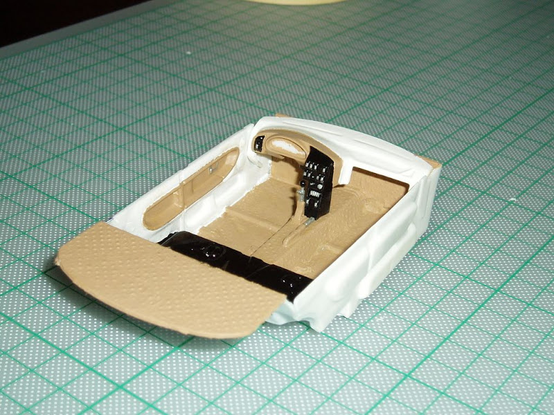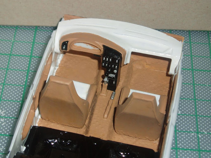two tone interior, with black center console seats from an old porsche 911 carera 2 cabrio (by Italeri) there are no seats at the back, so I painted it black semi-gloss I painted the under semi-gloss black and flat at some parts seats fitted black mat steering wheel |