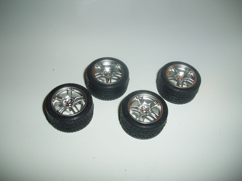 here are the original: here are the "new ones": here is a comparison: here is the body: its pre painted and with decals, but I dont want them, so I'll scratch them out and sand the paint off the body, if you know what I mean this is another view of the body: I'm not putting air wing , so I will close these two holes and here is a view of the wheels test-fitted on the BMW: I think they are ok, what do you think?? |