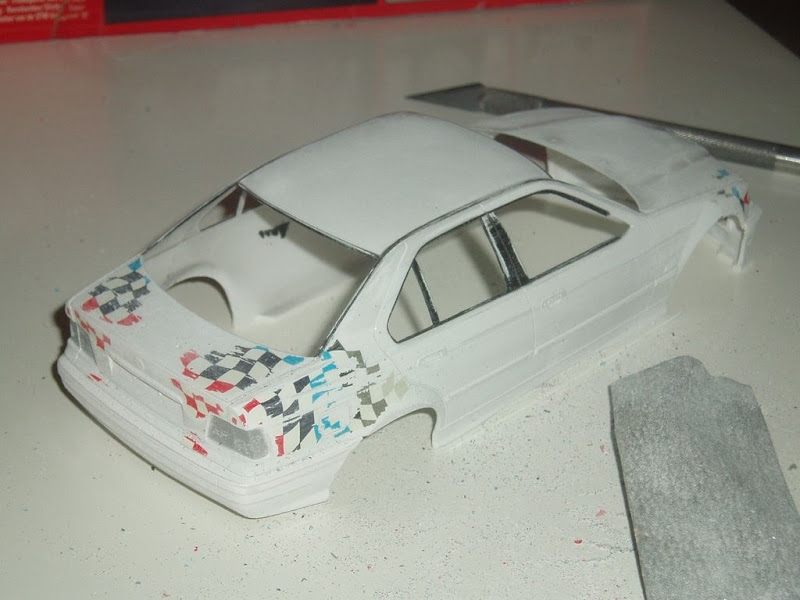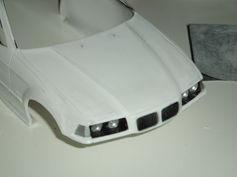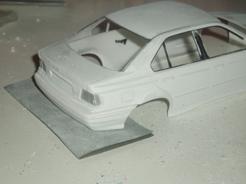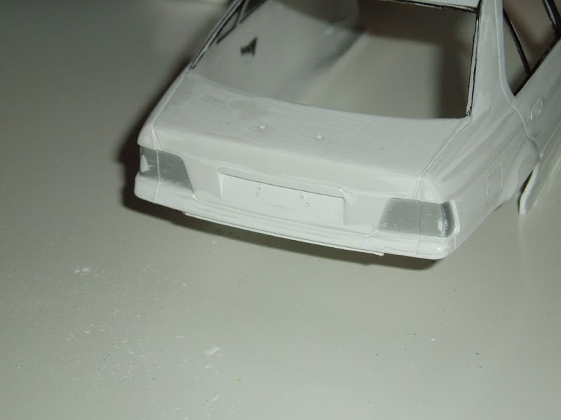 ok there was no problem, and I like the result. I think painting will be easier now that its sanded. well here are the pictures.. scratching started: more scratching and some sanding done: no more decals! and i also removed the bumpers (they were glued on - bad condition - not good fitted - too much glue) : test fitting the bumpers: removing the badges: rear bumper glued on again, and closed the wing holes: (I put a piece of styrene to close these holes from under) some work on the front bumper... and the body is ready! add some coments here... |