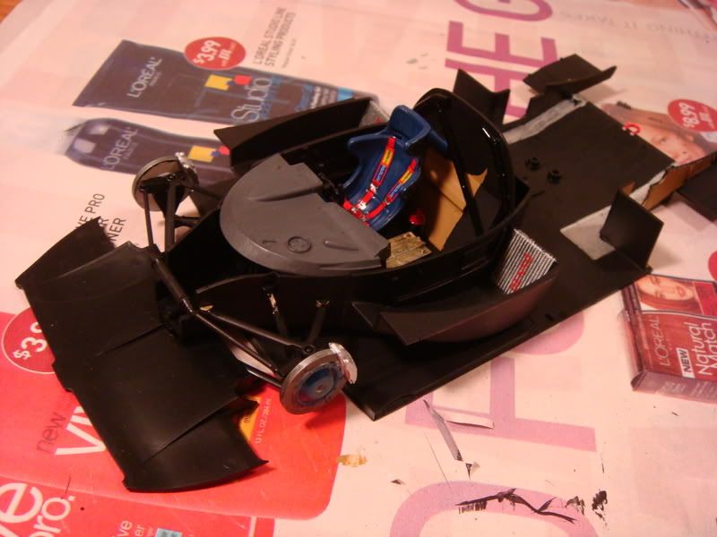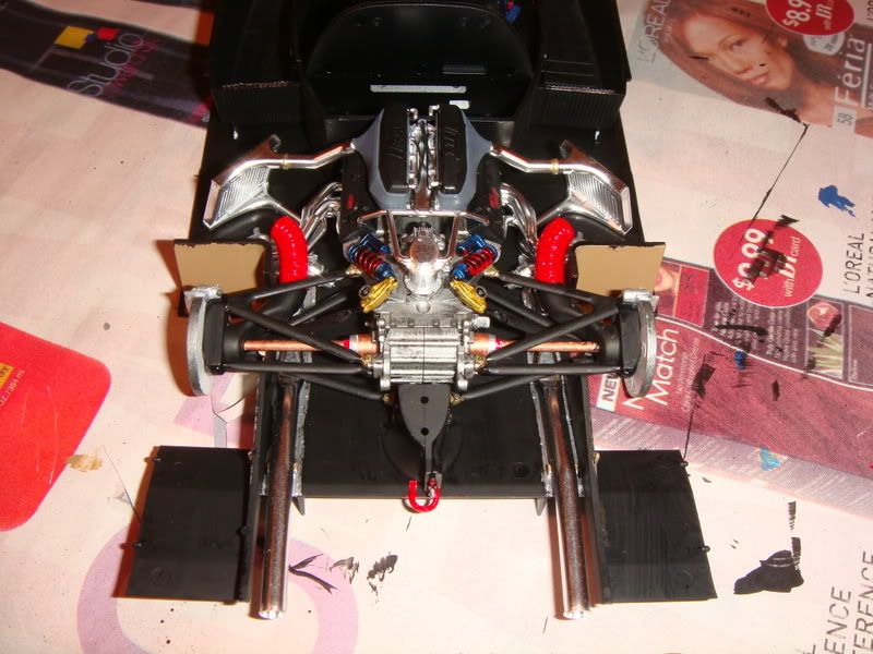He's right - it should look like this. Oddly Tamiya don't tell you to use the triangle pieces despite them being in the kit!! Here's mine. Also note the Marlboroesque markings on the rear wing.![]() ![]() Keep up the good work. It's a great kit and it's nice to see one being done.