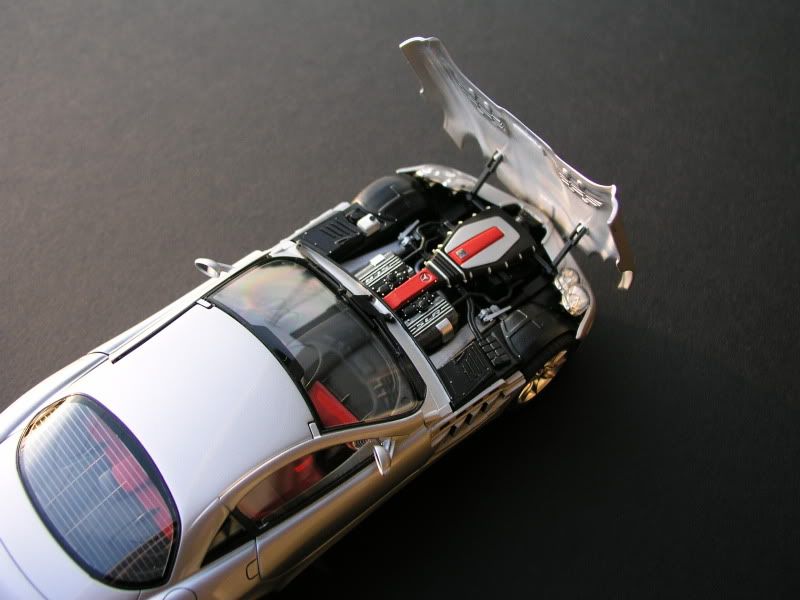 I think my main motivation was just to see if it was possible to build anything remotely resembling the box artwork as we didn't do any serious painting on the Ferrari. I actually finished it before I discovered this forum and have been too lazy to post the pics , but I finally got around to it. I guess I was lucky to choose this kit, because although it is a very slick and beautiful kit imho, it's really sort of basic and went together very well of course, which was perfect for my first attempt.Then I discovered automotiveforums and I was severely deflated - I just can't believe you guys, seriously, there are so many demented geniuses here. I doubt I'll ever become one of them, but I did try pretty hard with this kit - took about 2 1/2 months I think. It was too late to do a WIP but I've tried to take some pics. Yikes!, I thought modeling was hard, the photography is insane, not aided by my camera going mental on me..... Here's my WIP, yes, painted on newspaper ![]() ![]() And the first images, imagine my excitement!!! ![]() ![]() ![]() ![]() ![]() Crap!!! Talk about a bad paint job Oh wait, that was just my $650 (circa 2001) camera being creative Then I got lucky though, one camera recall and a free service later... ![]() That's Tamiya TS-13 over TS silver, it took me a while to get the hang of this, the paint darkens up a lot when you apply the TS-13, I think it's because when you lay down the silver the flakes tend to settle on top, but the TS-13 partially redissolves the base coat and draws the color forward. At the same time it seems to "float" the metallic particles which creates an amazingly realistic finish. So I'm in love with TS-13 over TS metallics, I've since tried other combos and could not really get the same effect. The Mercedes Star was done painstakingly with masking tape and enamel (yeh, novice) I painted the rear plate white and scraped back the edge for the frame... ![]() ![]() ![]() ![]() I tried some outdoor shots, my photography is terrible, for every decent pic, I took 250 duds... ![]() ![]() Very difficult to capture the interior, it's a nice leather-look red, done by mixing gloss and flat acrylic and deliberately spraying with a bit of orange peel. It looks very good up close. I discovered this because of my poor a-b technique! ![]() The B pillar should be silver, the instructions don't show it, but it should be - I might fix it sometime. The door sill is Alclad chrome with the SLR metal sticker on it. ![]() Unbelievably, I got all the decals on intact. ![]() ![]() The TS-13 is deliciously shiny, I love that stuff!!! ![]() ![]() ![]() ![]() I've started my second model now, doing a WIP for it too, will post asap. ~Mark |