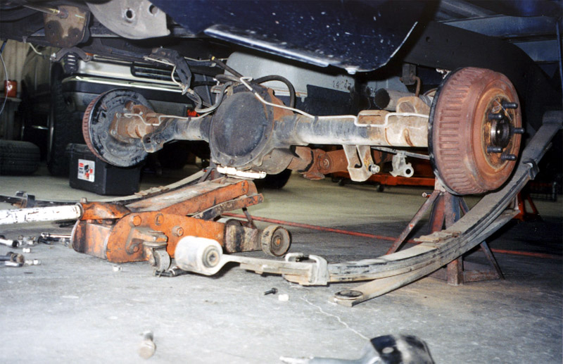 It's difficult to see, but the spindles have been flipped left and right. The spindles are shaped like: [] [] []= <-Stud for the wheel. [] So when you flip left and right, [] []= <Wheel is raised up. [] [] The rear, where the axle is above the leaf springs. |