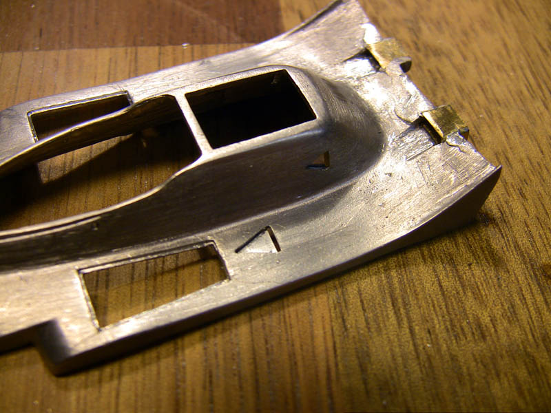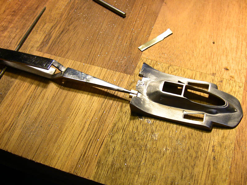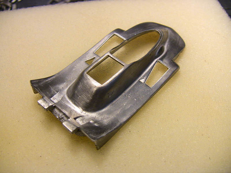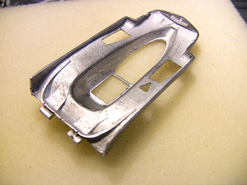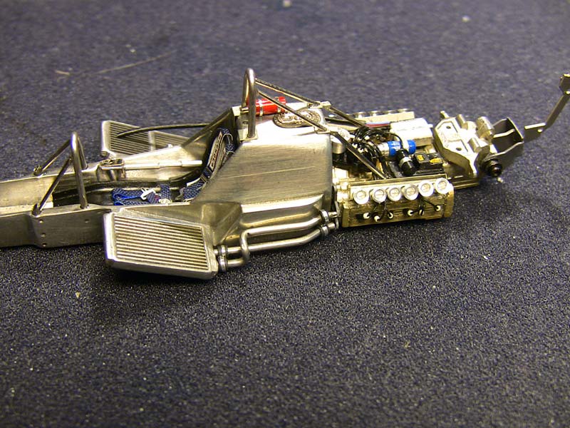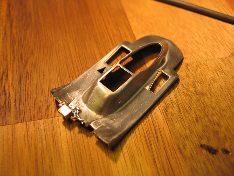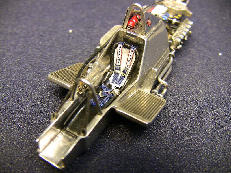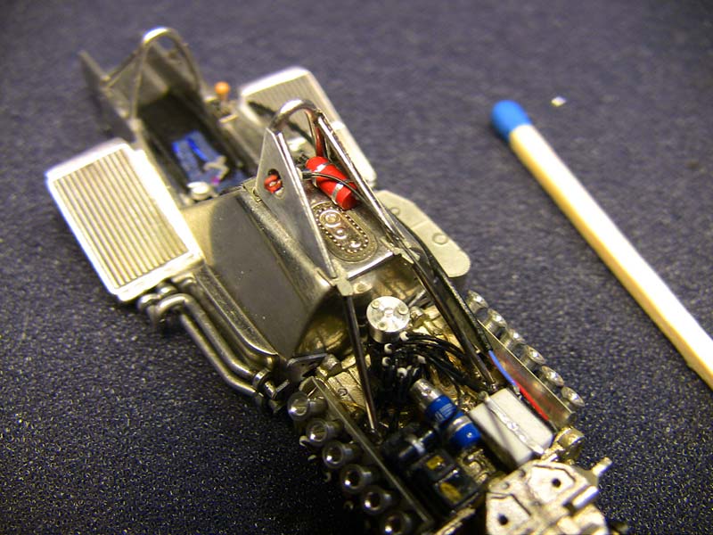 after a lot of sanding and polishing we have this and believe me it looks much better in reality..really :-) That cast in sterring part has to be removed and remod from metal tube...that knife fits so nice :-) A lot has happened. The PE colling meshes where "blackened" and sanded back to metal that only the recessed parts stay black. Die beiden Überrollbügel habe ich aus Metall selbst gebogen. The cover for the head rollbar has been cut from metal sheet.. There is also the new turend fire bottle (this has been remode allready, bigger and better ! ) and the from for the "emergency off switch". PE parts of the fuel tank are added but need further detailing to make it more 3D not so flat.. That is the original kit part, so I guess the scratchbuild rollbar looks nicer. The PE frame from the fueltank was golden..and I hate golden PE parts :-) I chemically made it silver mush better than painting. |