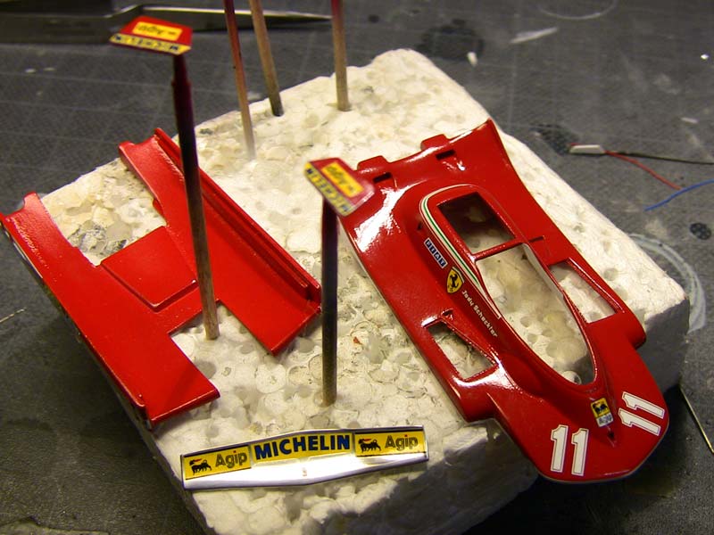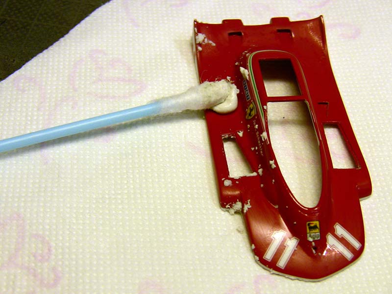 today I went for some realxing polishing. basic stuff, shiny surface but crappy looking :-) let's go sanding mith 3200 micromesh and nikken 2000 paper till the orangepeel dissapeard and everything is matt a little tamiya compound.....rub....rub....rub BANG...while removing the compound a nice part of the paint broke off..great ! Now I have to repair the whole crap...guee I will fill it with a brush and some red paint or any other advices ?!? on larger scale I would use the airbrush but not in 1/43 this is how I did the polishing...maybe someone wants to know -sanding 3200 micromesh and some parts with 2000 paper -polishing with tamiya coarse and fine compound -sanding with 6000 micromesh -polishing with tamiya fine and finish -a littel tamiya waxing OK, let's repair the accident...maybe I will redo the polishing when the new paint is on. daniel -germany- |