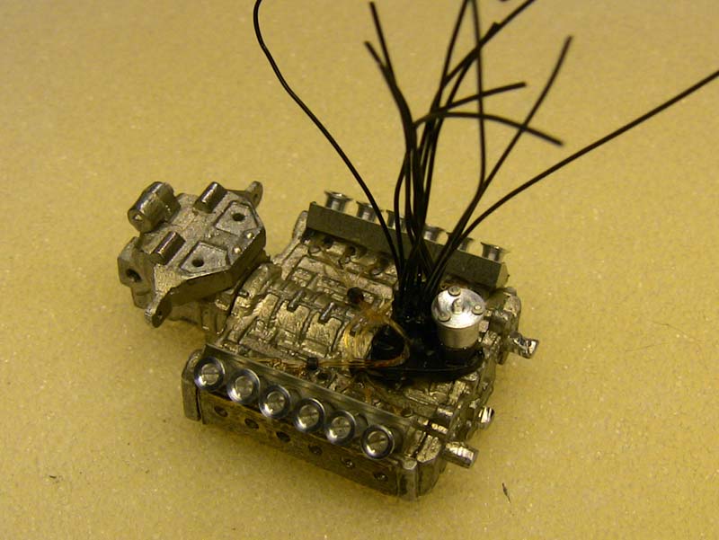 Painted and a little wash applied. The distributor was modified so that it can receive the plug wires. Due to it's small nice I only managed to drill ten holes in it instead of twelve, so I guess I have to fiddle those tow plugwires in there somewehere :-) Holes for the fuel lines have been drilled and 0.3mm fishingline was added. In the next step I removed the fishing lines and replaced it for 0.15mm line. After it was in place I painted it clear orange. The metal thing was turned on the lathe and detailed with PE nuts...but I have so idea what that thing is :-) A picture of the distributor withou the holes. The bottle has allready been cut of and will be replaced by selfmade turned piece.. A few of the ignitioncoil, that has alse been replace for a turned part. even more to come daniel -germany- |