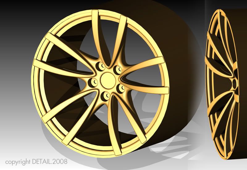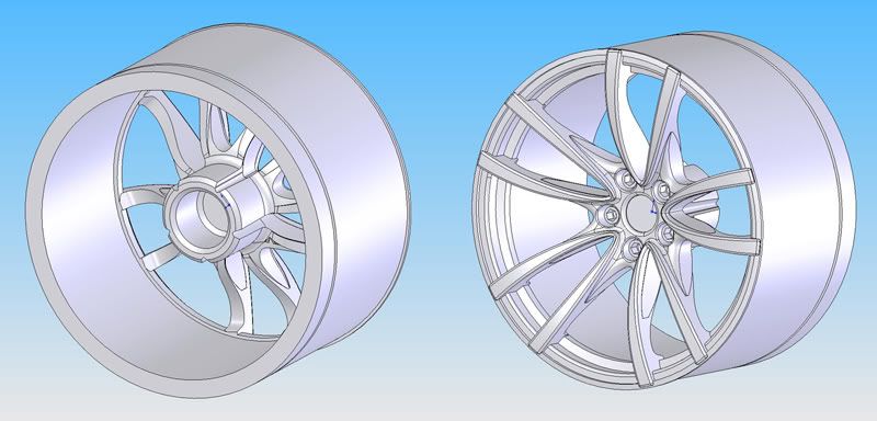 let me show the 1/1 beast: ![]() The plan: - 4 19" 5 (double) spokes rims to fill Fujimi tyres - bodykit with front damper, splitter, siderskirts, rear damper+extractor, rear spoiler/partial engine hood. Brake calipers. - PE set with grills (front and back), scuderia's signs, few internal details, simplified carboceramic face. - Internal detail: consolle and seats. - decal sheet with scuderia's signs and stripes in two colors, dark silver (black surround) and white (ever black surround) I'm wondering to work also on a "premium pack" with full carboceramic discs, engine pack (not Tamy clone, 100% 430 engine by CAD CAM, good also for the standard 430) and may be some sunspensions detail to switch the Fuji kerbside to a full detail kit. At now I finished rims, 90% finished the bodykit. I have 70% PE ready and I must design strips for the decals sheet. Let me show how I done, starting from rims. ![]() I designed the rim with a CAD software, size is just a bit bigger than the current challange rims. I done 1 only size, than I'll cut inside the prototype to allow the resin caster service to make both fron and rear wheels. In this first rendering there's some detail that was correct later (see following B/W renderings) ![]() I designed the inside connection just like the Fuji one: ![]() And after some days, this is the prototype I got from the service: quality is good (layer step 16 micron), anyway i like to show you before a light sanding finishing to smooth it out for the casting: ![]() I'll post the whole bodykit in a couple days, may be over the weekend: I like to show it finished and primered, I need just to do few touches at rear bumper ![]() Since I didn't designed yet decals I'll like to know by you if would be good to have different colors for the scuderia's strips: at now I seen just the presentation car , F1 red with silver (a kind of dark silver?) strips and the Top gear Azzurro california's 430 with some strange grey strips. My desire is an azzurro's 430 with white strips (black surround), and I guess white/black surround strips fit well also a giallo modena 430, and the silver/black for a silver or black (or red) 430. Any thought concernig strips colors? Someone has more info about the production? Thanks a lot for the attention, I'll back with the bodykit soon.