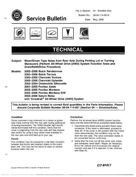I have an 02 silhouette AWD (Versatrak), 94k mi. It has a whine/howl that appears to be coming from the rear of the vehicle. Could it be the AWD? I have never serviced it. Also, I recently put new tires on the front and not rear. Same P-size tire, but diff brand. Any suggestions on where to start?
