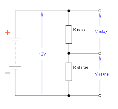 The quick answer is that the relay coil and the starter 'Hold' winding form what's known as a 'potential divider' circuit, in which the resistance of the relay coil will exceed the resistance of the Hold winding by a considerable ratio - at the very least, I'd say 40:1 but it may in reality be a much higher ratio. The voltage will be split proportionately, leaving very little voltage across the Hold winding and that's why it isn't able to energise the coil sufficiently to engage the solenoid plunger during normal running. That's the quick answer, but to explain it in greater detail, here's a quick guide to basic resistive potential dividers: If you take two (or more) resistors and place them in series across a supply voltage, the voltage will be split between them. Fig.1 shows a supply voltage of 12V, with two resistors of equal value connected in series across the supply rails. Because the resistors are of equal value, the voltage will be divided equally, with 6V being dropped across one resistor and 6V across the other. I'll use resistance values of 100 ohms, but the values could just as easily be, say, 50,000 ohms - provided the resistances are equal, the voltage will be divided equally (the current flowing in the circuit would of course reduce if using 50 Kohms instead of 100 ohms, and in real-life, the resistor values would be chosen to suit the particular application). Fig.1 ![]() Fig.2, below, shows the same 12V supply rail, but this time with unequal values of resistance. The upper resistor, R1, has been increased to 300 ohms, while the lower resistor, R2, is still 100 ohms. The supply voltage will be divided proportionately, and thus R1 will have 9V dropped across it and R2 will have 3V across it. Fig.2 ![]() So that illustrates the way that the voltage is split proportionately to the resistance values in a simple resistive voltage divider, but just to verify that my assumption of having 9V across the upper resistor, R1, is correct, let's do the calculation: VR1 (i.e. the voltage across R1) = Vsupply * R1 / (R1 + R2) VR1 = 12 * 300 / (300 + 100) VR1 = 3600 / 400 VR1 = 9V If we have a supply voltage of 12V with two resistors in series and we're dropping 9V across R1, then the voltage across R2 must be 12V - 9V = 3V, but let's just confirm that again by calculation: VR2 (i.e. the voltage across R2) = Vsupply * R2 / (R1 + R2) VR2 = 12 * 100 / (300 + 100) VR2 = 1200 / 400 VR2 = 3V And so we do have the voltage split as predicted: 9V across R1, and 3V across R2. So, enough about voltage dividers - let's look again at the circuit comprising the relay coil and the starter Hold winding. The relay coil and its parallel suppression resistor are shown as Rcoil and Rs in Fig.3. Turning now to the starter assembly, I've been referring to the current as flowing through the Hold winding for the sake of convenience and to avoid unnecessarily complicating matters, but if you look more closely, the Pull-In winding and Motor windings (both in series) are in parallel with the Hold winding. Current will therefore flow through that complete network instead of flowing through just the Hold winding alone, so the circuit looks like this: Fig.3 ![]() If we knew the values for the relay coil and its parallel suppression resistor, we could calculate the effective resistance and represent them by a single resistor, which is shown as Rrelay in Fig.4, below. Similarly, if we had the values for the Pull-In winding and the motor windings, we could calculate the series resistance, and then calculate the effective resistance when that is placed in parallel with the Hold winding, and represent the total resistance of that series-parallel starter network by a single resistor, shown as Rstarter, below. Fig.4 ![]() So the simplified circuit boils down to nothing more than a simple voltage divider with two resistors in series across a 12V supply, which takes us back to where we started, and if we use my estimate (and I reckon that's a conservative estimate) of the relay coil (with its parallel resistor) having a resistance at least 40 times greater than the starter network resistance, and knowing that the (nominal) supply voltage of 12V will be divided proportionately between the two resistances, then the voltage across the relay will be: Vrelay = Vsupply / 41 * 40 Vrelay = 12 / 41 * 40 Vrelay = 0.293 * 40 Vrelay = 11.71 and the voltage across the starter network will be: Vstarter = Vsupply / 41 * 1 Vstarter = 12 / 41 * 1 Vstarter = 0.293 * 1 Vstarter = 0.29 (Both answers rounded off to two decimal places). So the voltage distribution would be something like this: Fig.5 ![]() So, from the supply voltage of 12V, 11.71V would be dropped across the relay, and the remainder of just 0.29V dropped across the starter, and that is the reason why they have been able to configure the circuit in the way that they have. The voltage across the starter network is far too low to cause either the Pull-In winding or Hold winding to actually move the solenoid plunger, and also far too low to cause the motor to rotate, although a weak magnetic field will always be present in all three components whenever the key is in the Run position - i.e. during normal driving. Interesting stuff eh, or maybe not, depending on your point of view, but I don't ever get bored of volts and ohms and amps. |