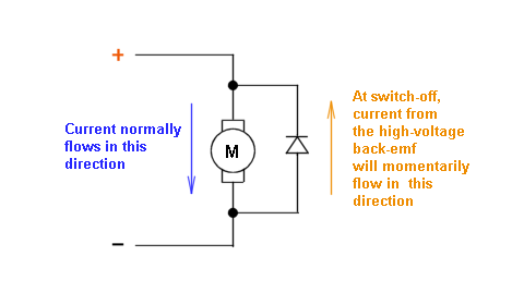 If using only a single coil, the solenoid current would remain at the higher pull-in level for the entire duration of cranking, but with two coils the higher pull-in current only flows very briefly while the solenoid plunger travels the short distance from its rest position to its pre-engaged position where it is meshed with the ring gear. At that point the contact disc will bridge the B and M terminals (and thus the motor will run) but also that will cause a short-circuit across the pull-in coil (12V on the high end from the S terminal, and also 12V on the low end from the B terminal) - thus it will no longer be energised, leaving just the Hold winding energised by the 12V from the S terminal. The Hold coil will have a much higher resistance than the Pull-In coil, meaning less current flow and thereby freeing up some current to be used by the starter motor. I think it's the case that they're not necessarily two separate windings, but they can be a single coil with a tap part way along its length, and that tap point would connect to the S terminal and become the 'high' end of both coils. Unfortunately, coil resistance values and the coil phasing are not normally included on wiring diagrams so the action isn't always clear, but I reckon that's why they use two coils instead of one. The diode point is a much more interesting one, because it's reverse-biased so it looks like it would never pass current and would never serve any useful purpose eh. As we know, a diode will pass current when forward-biased, i.e. anode positive with respect to cathode, but it will block the flow of current when reverse-biased, i.e. cathode positive with respect to anode. Device symbol: ![]() Component marking: ![]() The reason why a diode is in the circuit is because the circuit at that point contains an inductive load - three of them actually - the two solenoid coils and the motor, and when you break the current flow in an inductor - i.e. switch off the current which feeds the inductive device, something called back-emf (electromotive force) is generated and this will have a polarity which is opposite to that of the supply voltage. The amplitude of this back-emf, or voltage spike, can easily reach hundreds, even thousands, of volts, even when fed from a low-voltage source. This spike obviously has the potential to damage semiconductors in the circuit, so measures are taken to suppress it. A number of methods are used but most commonly it's dealt with by adding either a reverse-biased diode, or a resistor, in parallel with the inductive component. Both methods can be seen in the 1.9L starter circuit - a single reverse-biased diode is utilised to kill the spikes from all three inductors in the starter assembly, and a parallel suppression resistor absorbs the spike from the coil of the Cooling Fan Power relay. The amplitude of the spike which will be induced in any given circuit can be readily calculated if three factors are known: the inductance of the coil, the amplitude of the current flowing through the inductor at the instant of switch-off, and the time taken for that current to collapse to zero. The numbers are then slotted into the formula for self-induced back-emf, which is: e = - L * di / dt where L is inductance (the standard unit for which is the 'Henry'), di is the change in amplitude of the current (in amps), and dt is the time taken for the current to collapse to zero (in seconds, but in practice that would typically be mere milliseconds). The interesting thing about that formula is that the supply voltage simply isn't a factor, and thus considerable back-emf - even several thousand volts - can be generated from the lowest of voltages if the other conditions are met - large value of inductance, high current flow, and fast switch-off. In auto-electrics, reverse-biased protection diodes are commonly utilised on DC motors, where they would look like this: ![]() When a diode is forward-biased, it has a voltage drop of around 0.7 volts, increasing slightly as current increases. In the circuit above, the diode is reverse-biased during normal operation and thus plays no part in the proceedings. At the instant of switch off though, the magnetic field in the motor's (inductive) windings will collapse, and the stored energy will be released in the form of back-emf - a voltage spike with a polarity which is the reverse of the supply voltage. The diode will thus become (very briefly) forward-biased and will limit the amplitude of the spike to a safe level. In the case of the Cooling Fan Power Relay in the 1.9L, a suppression resistor is fitted in parallel with the (inductive) relay coil. Under normal working conditions when the relay is energised, some current will flow through the coil, from high end to low end, and some through the parallel suppression resistor - which at this point serves no useful purpose. Upon switching the relay off though, a voltage spike will be induced, which will find a ready discharge path through the parallel resistor, which dissipates the power as heat. In the commonly-seen arrangement whereby a relay is used to power a DC motor via its switched contacts, spike suppression would be required at two points in the circuit - at the relay coil to suppress the spike generated there when the coil is de-energised, and then also at the motor to suppress a quite separate spike which is generated simultaneously when the magnetic field in the motor windings collapses at switch-off. In that case, you would probably find a resistor in parallel across the relay coil, and a reverse-biased diode in parallel across the motor. The reason for the suppression in all cases is to protect the rest of the circuitry from the high-voltage spikes, particularly the voltage-sensitive semiconductors within the electronic control modules, CD player, radio, etc., and also to prevent those spikes from causing radio frequency interference (RFI) on the AM band of the car radio (electrical noise is less of a concern o