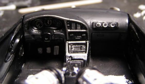 I finished the interior. I used some scrap CF decal for the dash trim. The kit didn't come with gauge decals, so I chopped up an extra Integra one that I had and arranged it like the one in the flick.
