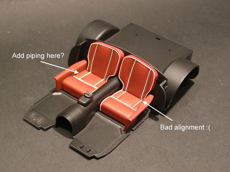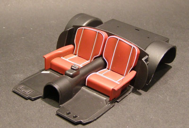 )The seats were primed in white primer, I pre-shaded the creases with Vallejo Air Black and then painted with Vallejo Air Fire Red (IIRC). They will be getting a final cover of Vallejo Air Satin clear. The white piping on the seats is stretched sprue fixed with dots of thin CA. Hope that answers your question?