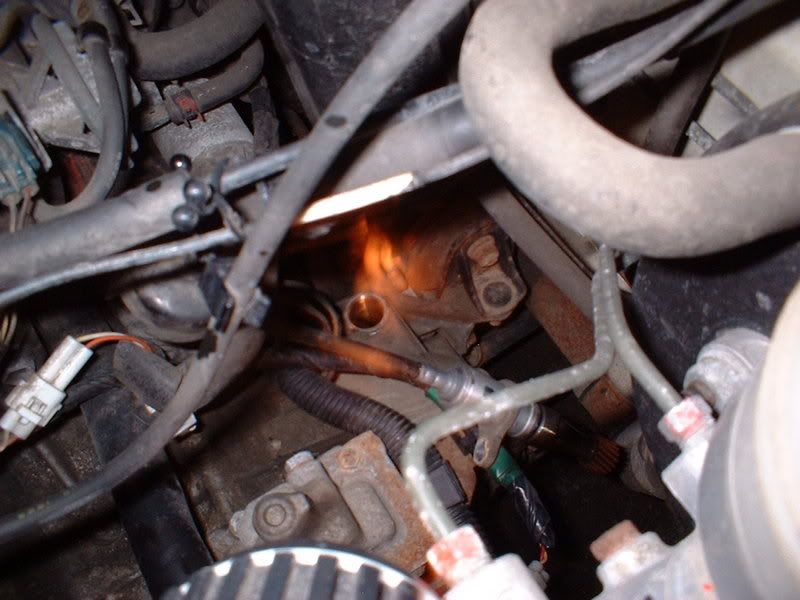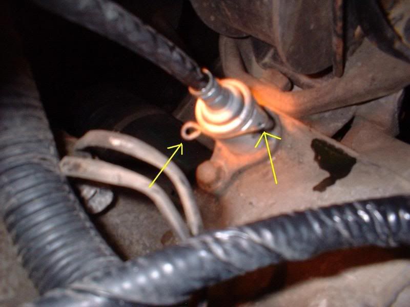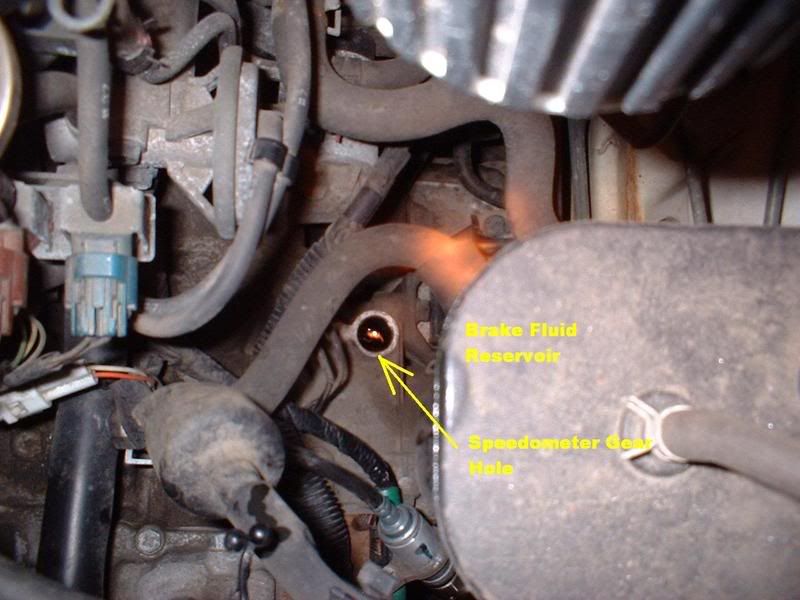 I changed the gear oil in my 96 3 cylinder 5 speed using Crvett69's suggestion. I used the speedometer cable gear hole. Here is what I did: DO NOT DRAIN THE GEAR OIL AT THIS TIME. Make sure you can get the Speedometer gear out and/or the filler plug first. Won't do you much good if you drain the oil and not be able to put any back in. Now, for the speedo gear: 1. Locate the speedo gear. Go to the brake fluid reservoir and look straight down. It looks like this:: ![]() Make sure the area is clean, use a vacuum if necessary. I undid the wire holding the cable with the green connector to make it easier to access the 10 mm bolt. 2. Slide the black cover up the speedo cable and this is what the assembly looks like: ![]() The black puddle to the right is where I missed the funnel LOL I would probably use a longer one next time so I don't have to maneuver the bottle through the hoses/wires to get to the funnel. I used a 12 inch funnel so maybe a 16 inch one would be better. The arrows are pointing to a clip but you can probably leave it in since the whole assembly will slide out. You might have to wiggle the assembly back and forth while pulling on it, but it does come out by hand: ![]() I apologize for the blurriness but the box shows the whole assembly. The gear is that little blurry thing at the left-center of the box. LOL That yellow thing to the left of the box is the funnel. Removing the speedo gear assembly leaves about a nice big, 1 inch filler hole, just to the left of the center of the photo, by the orange glow of the flashlight : ![]() Here's another shot looking straight down. The brake fluid reservoir is in the lower right of the picture: ![]() Now DRAIN the oil out of the transmission. Now you can refill it. The funnel I used is about 12 inches long and it worked ok although I would recommend using a little longer funnel, maybe 16 inches or so. The nice thing about using this method is that you can just unscrew the cap on the gear oil container and just pour it in without having to squeeze the oil through that ridiculously small nipple. The oil comes out nice and quick this way: ![]() Once I got the speedo gear assembly removed, I drained the trans. Hope this helps someone. The picture of the hole was taken after I filled the trans. The oil went into the trans as you can tell by how clean it is around the filler hole. That shiny dot in the middle of the hole is the flash reflecting off the fluid in the trans. Thank you Crvett69. This makes changing the trans fluid almost as easy as changing the oil.